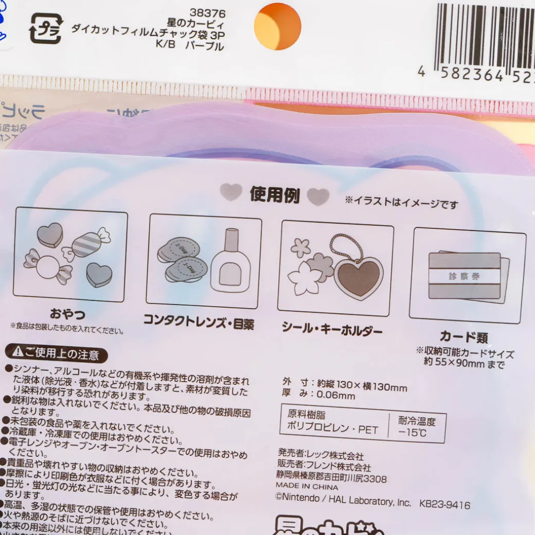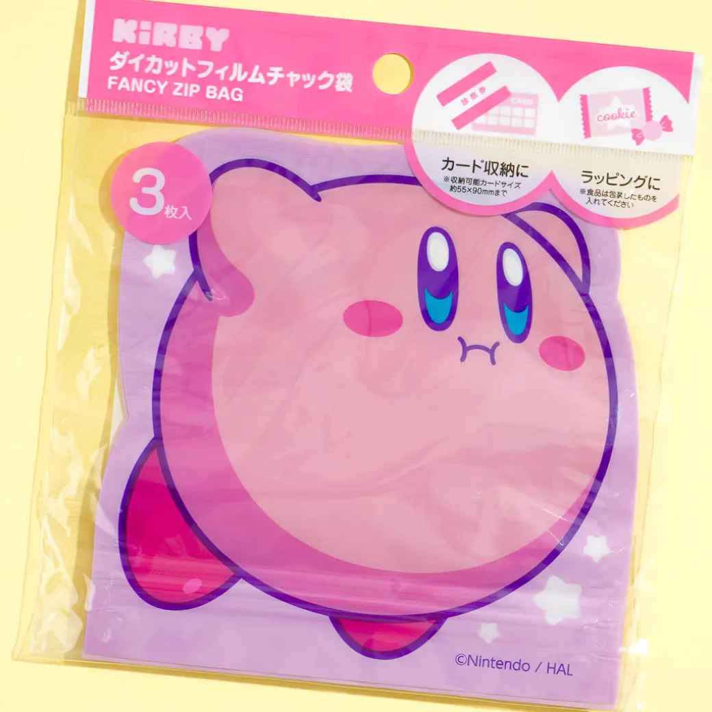 Store trinkets, candies, and other things inside this super cute set of die-cut zipper bags. They feature Kirby hovering!