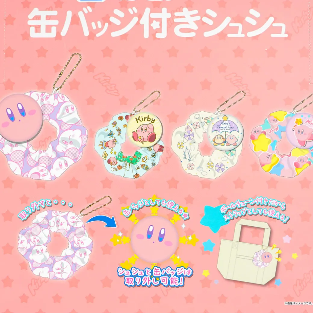 Show your love for Kirby by using this super cute scrunchie with tin badge! The badge is removable so you can use the scrunchie on your hair and pin the badge to your jacket. Plus, you can even put the two together and attach them to your bag using the removable ball chain!