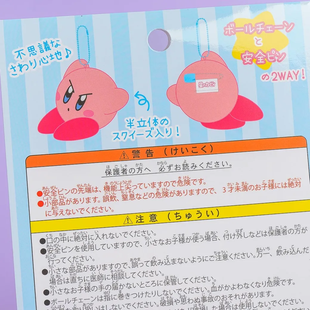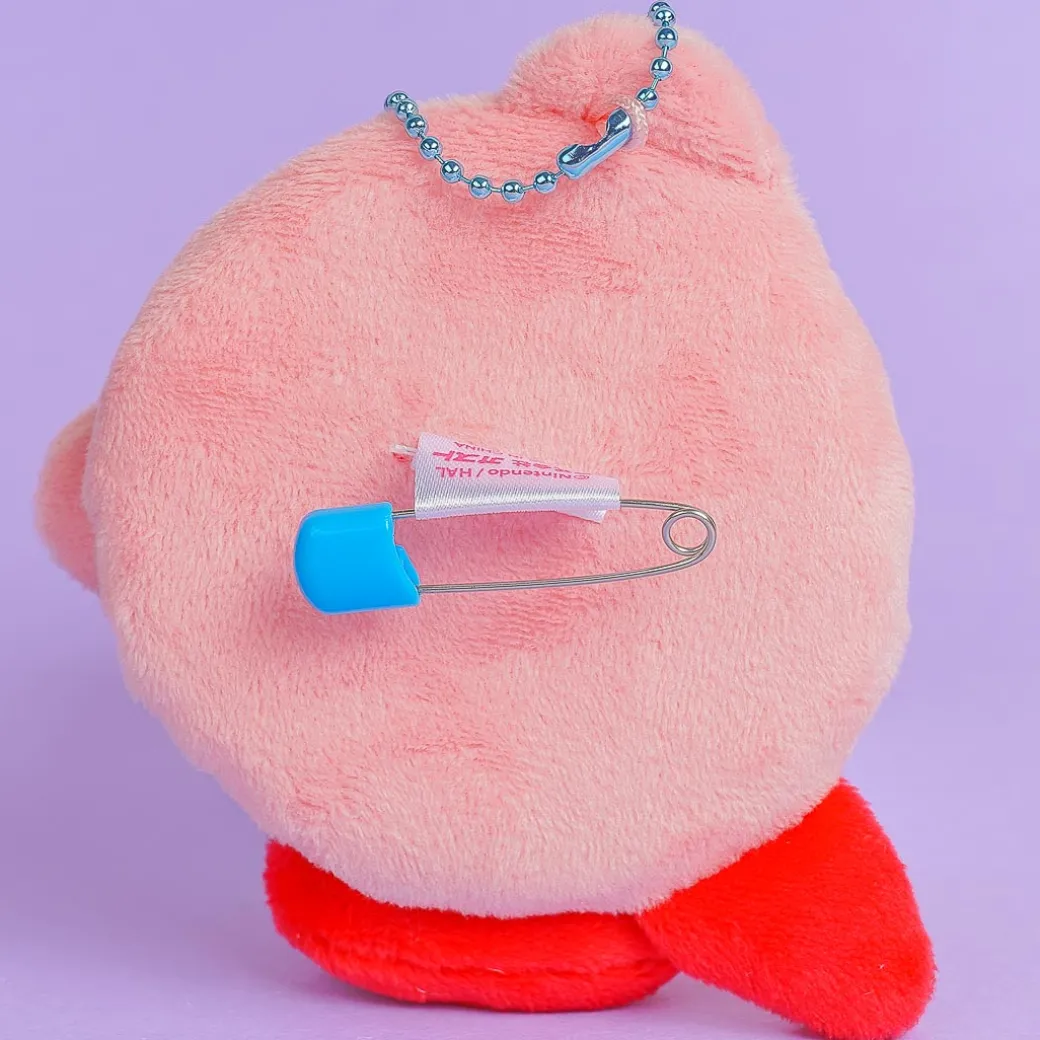 This medium-sized Kirby plushie is in a sliding pose with a serious-looking face. It’s a two-way plushie with a removable ball chain and pin on its flat back so you can easily attach it to your bag!
