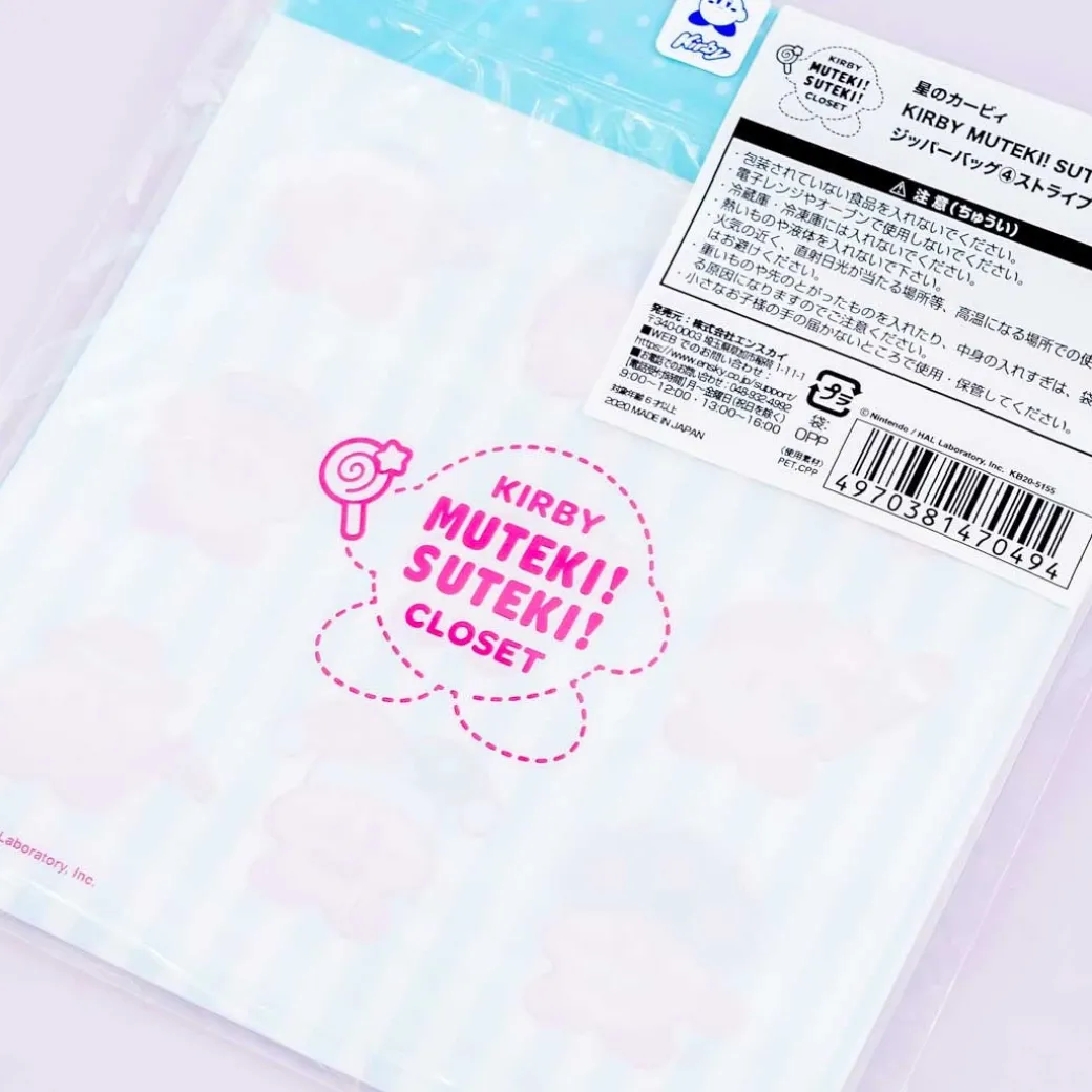 - A cute set if stripped zipper bags illustrated with Kirby wearing different costumes