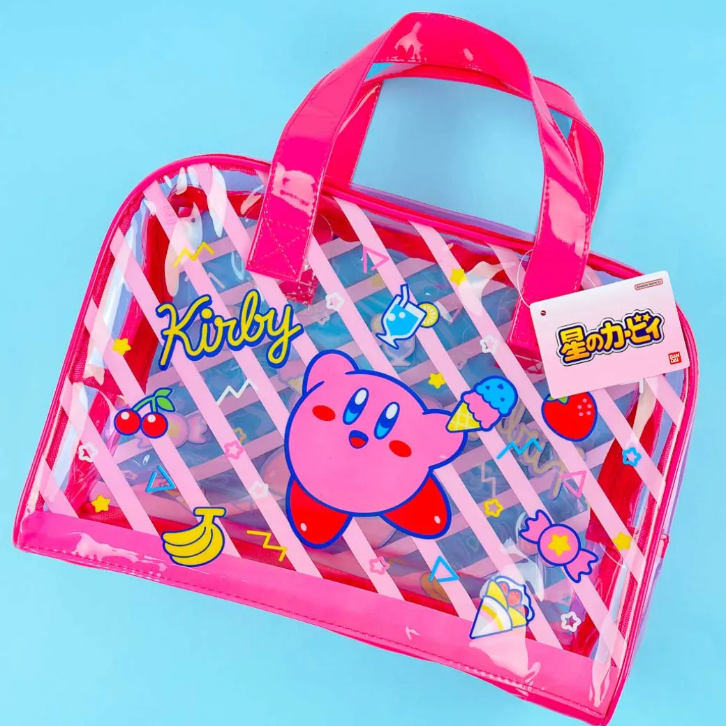 Keep your summer essentials inside this kawaii clear handbag! It’s decorated with cute lively prints of Kirby with his favorite sweets like ice cream, crepes, fruits, and more. You can take it with you to the beach!