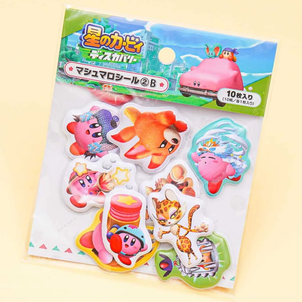 - A pack of puffy stickers showcasing Kirby and his friends from the Kirby Discovery series