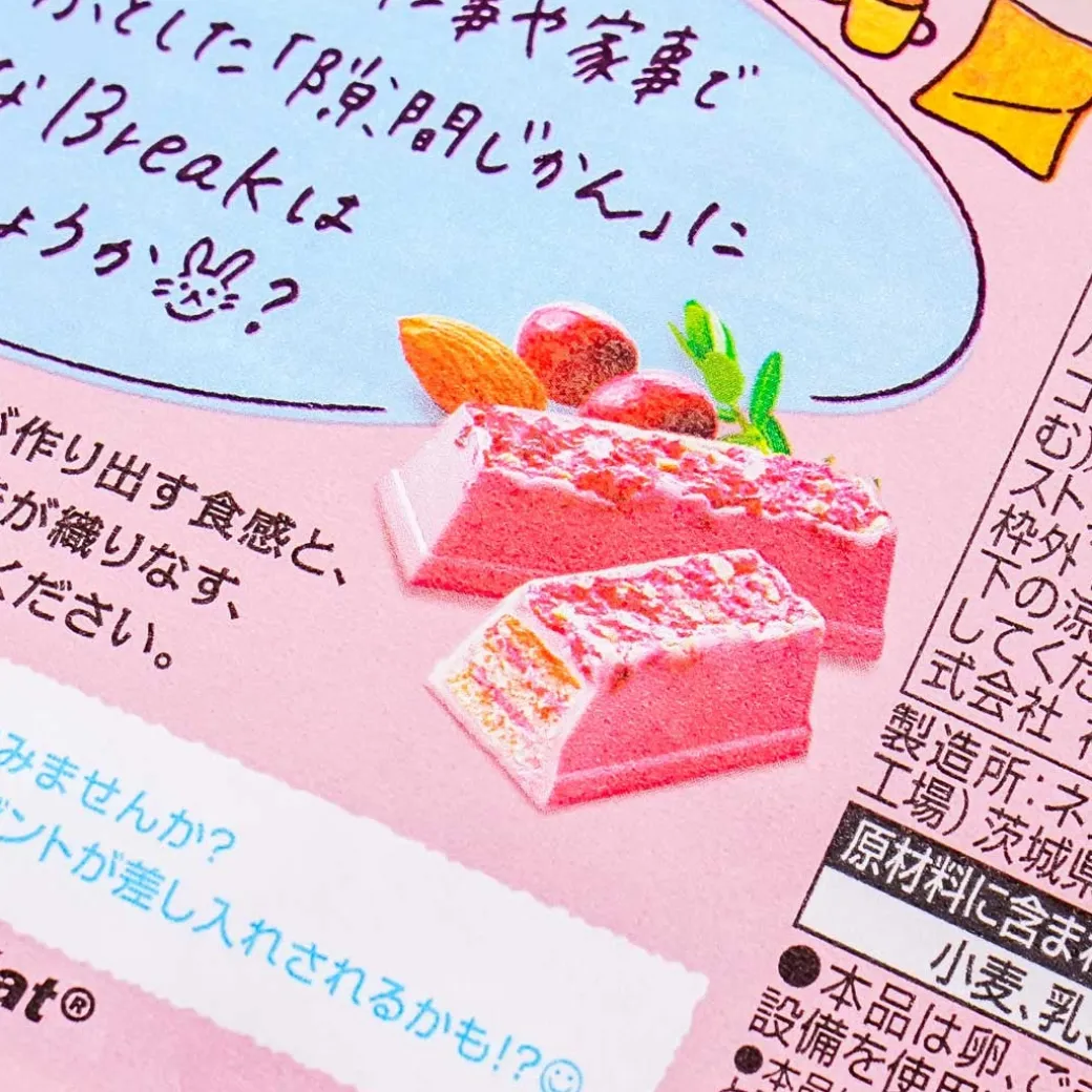 - A pack of wafers coated in pink ruby chocolate topped with cranberries and almonds