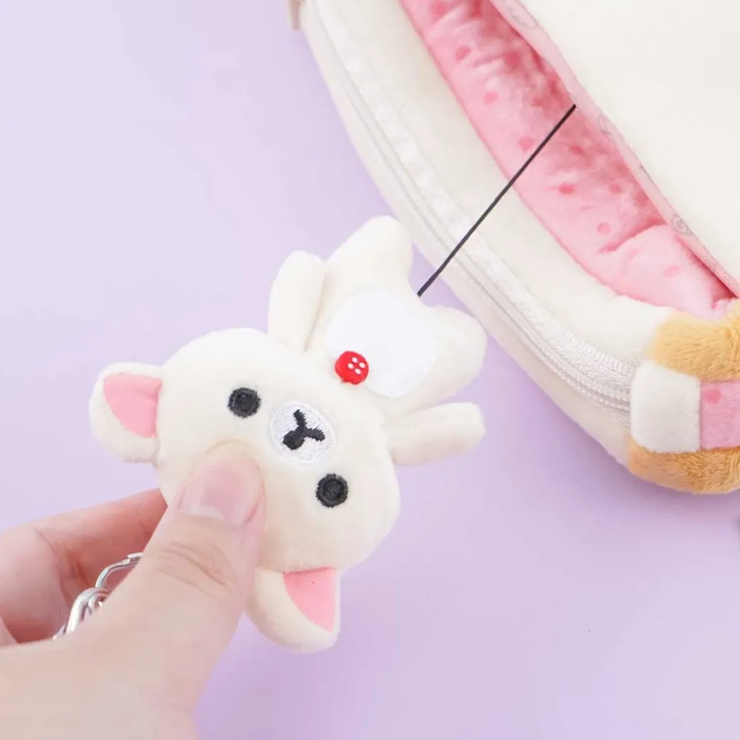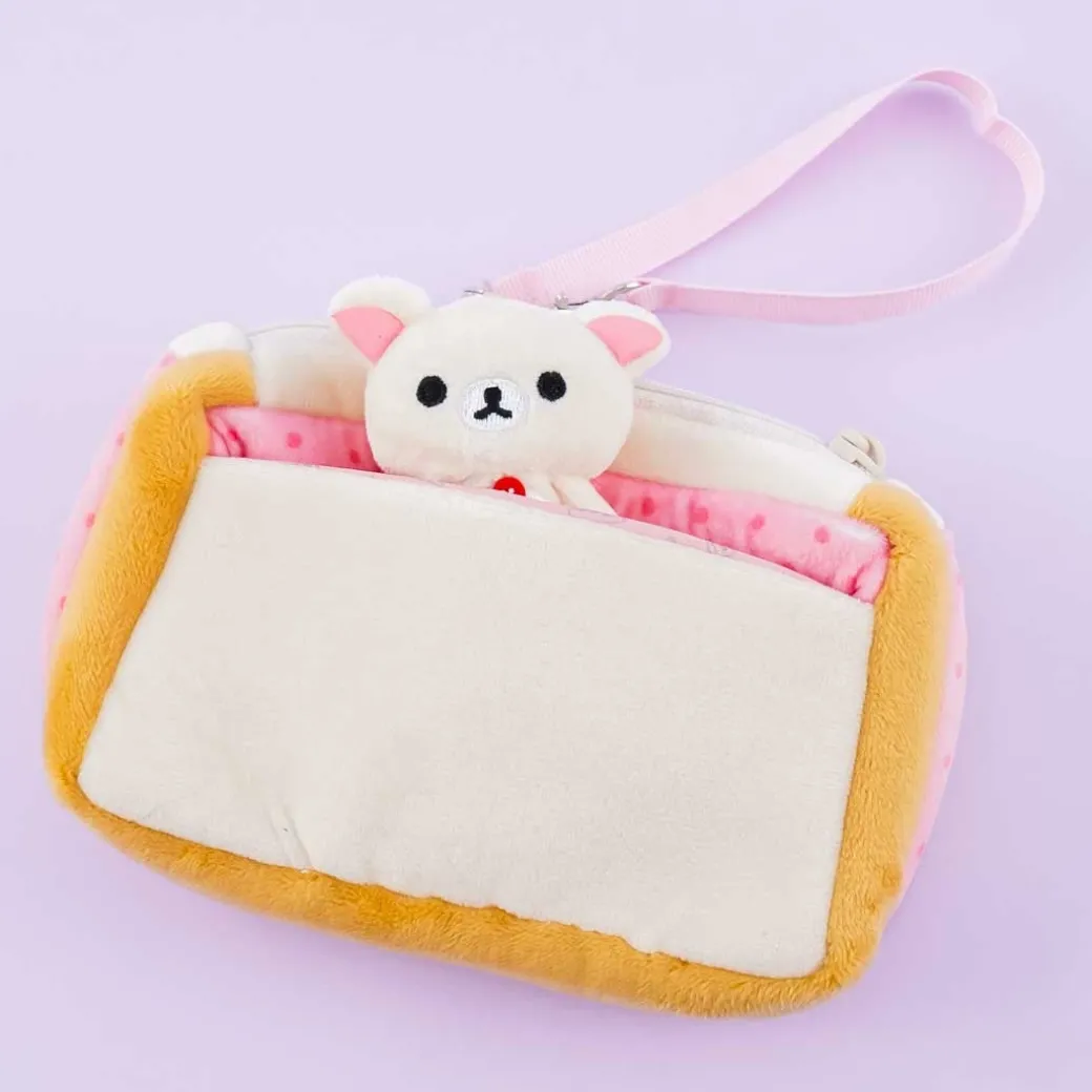 - A super kawaii strawberry jam sandwich plushie pouch with a Korilakkuma plushie decor attached to a reel