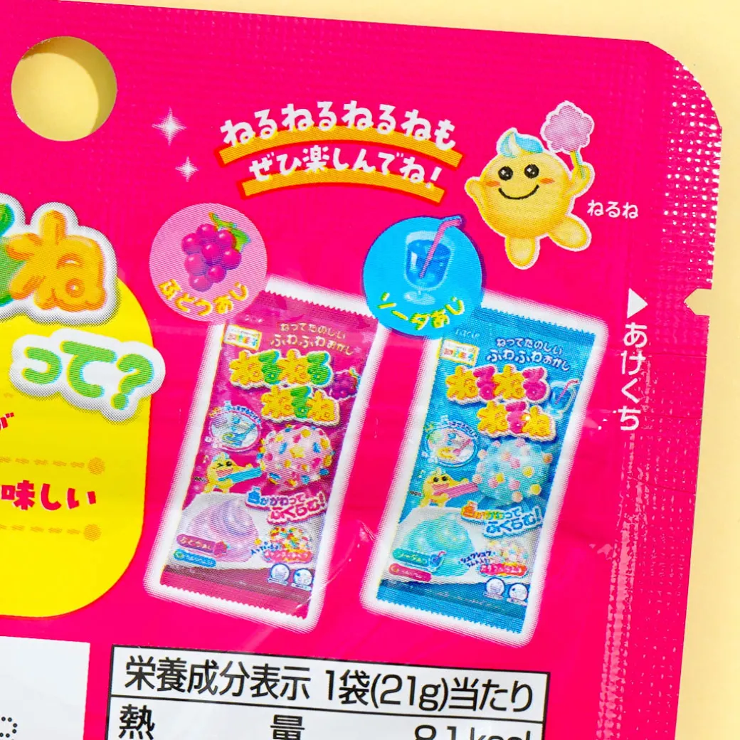 Enjoy the taste of the popular Nerunerunerune DIY candy in ready-to-eat ramune candy form—no water or mixing required! This bite-sized version features grape and soda flavors with an extra fizzy kick.