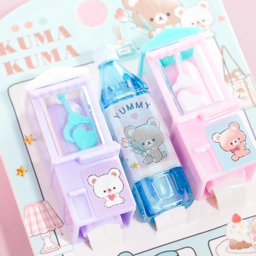 Protect your pencils’ lead tips from breaking by placing these super kawaii caps! Two are shaped like mini crane game machines and one looks like a soda bottle. The set is decorated with prints of cute bears!
