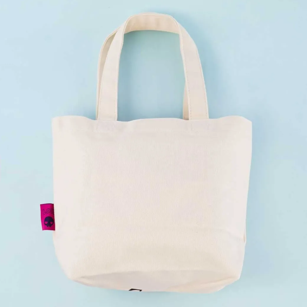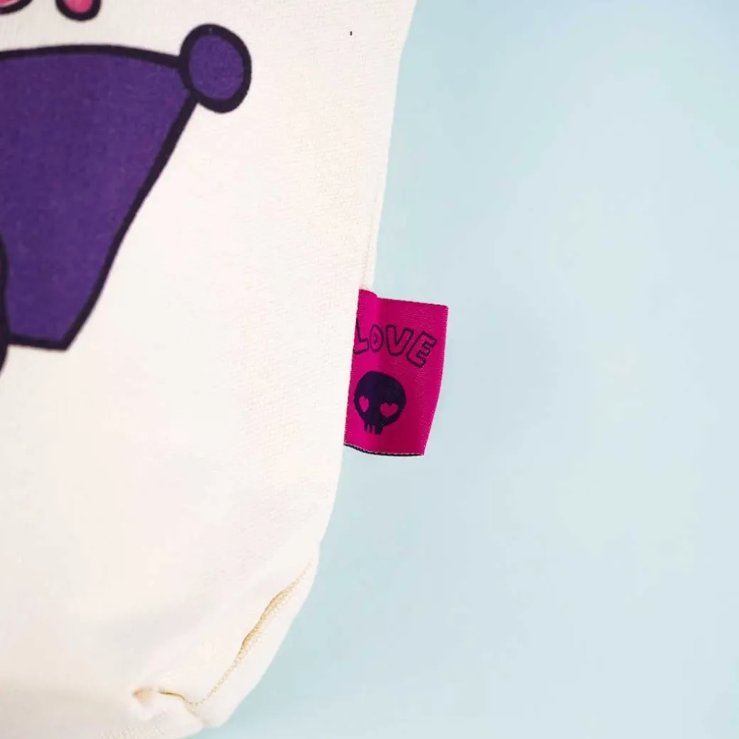 - A kawaii reusable mini tote with an illustration of Kuromi doing a flying kiss