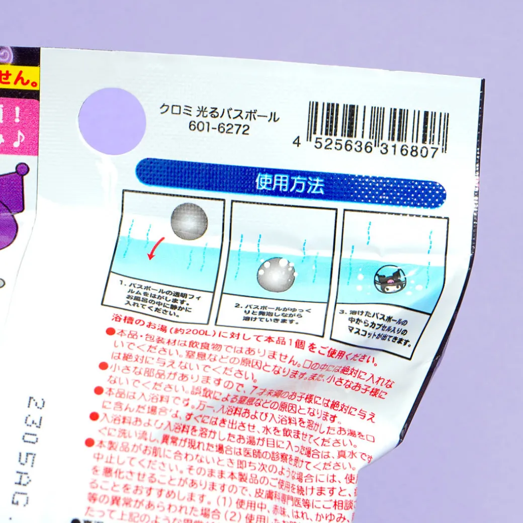 Relax and have fun in the tub by using this special bath ball! It features a fragrant peach scent and comes with a Kuromi toy inside. This cute toy lights up in three different modes when pressed.