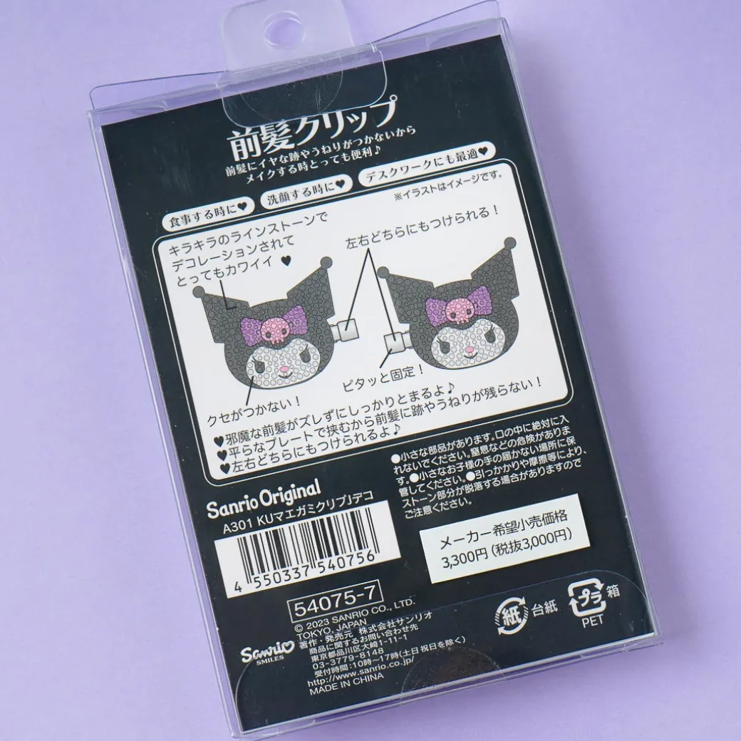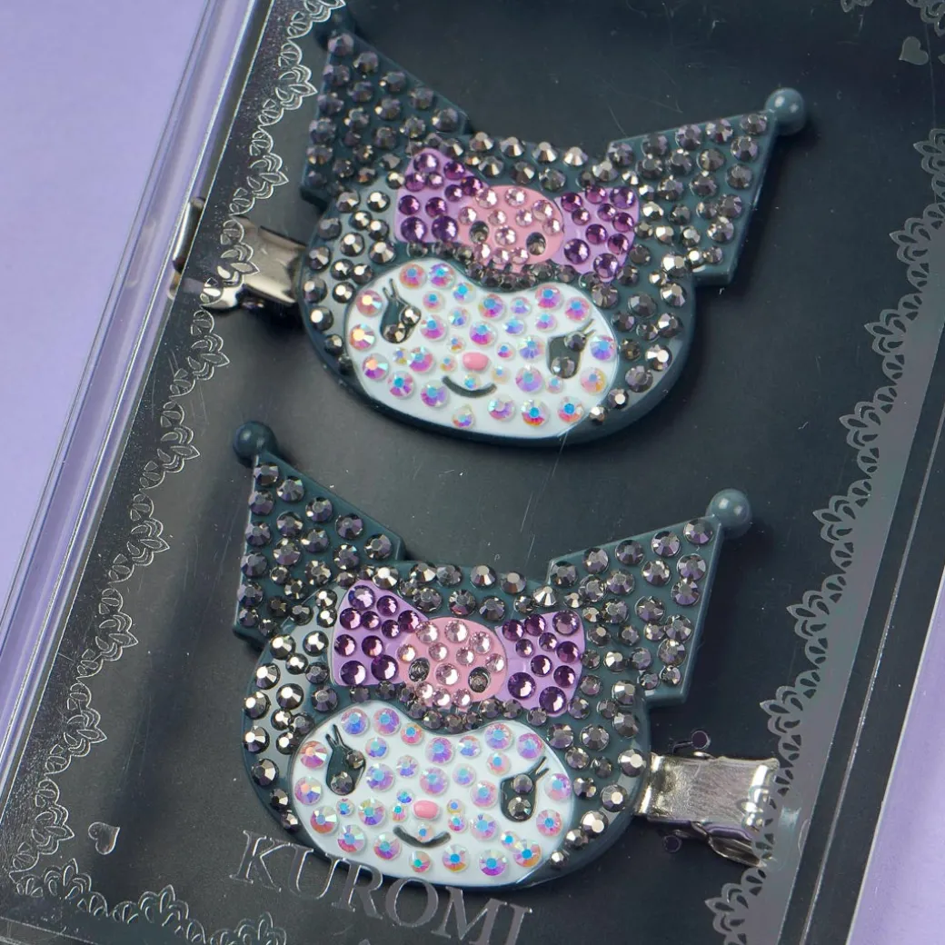 Kawaii-fy your hairstyle with this super cute Kuromi hair clip set! Each piece is filled with sparkly jewels.