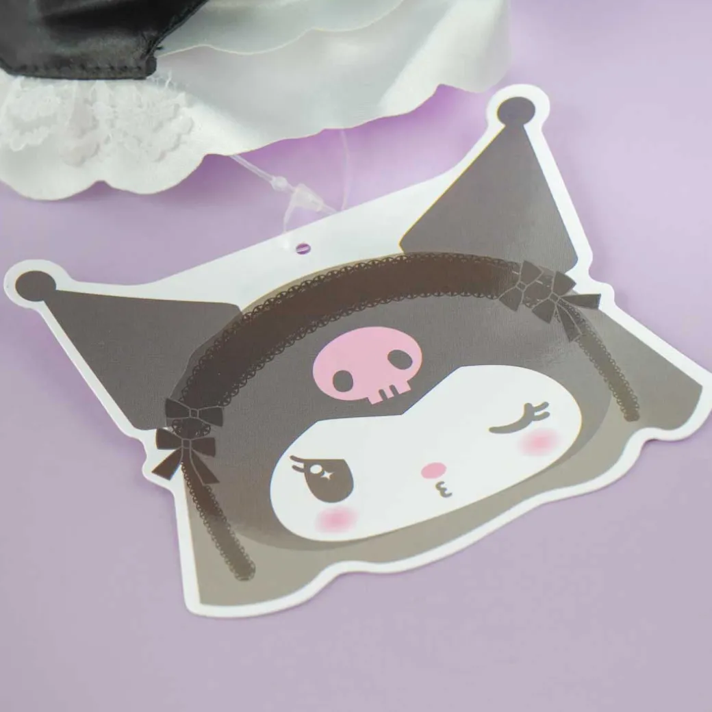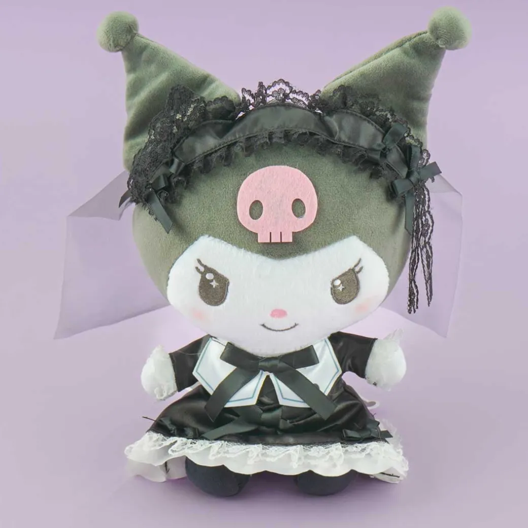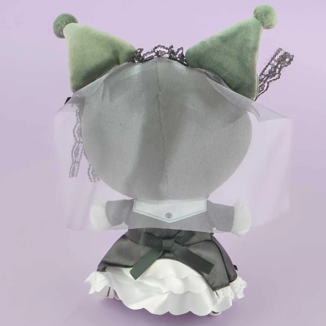Add this kawaii Kuromi plushie to your collection! This small-sized cutie is wearing a long black Lolita dress and a lace headdress with a veil.
