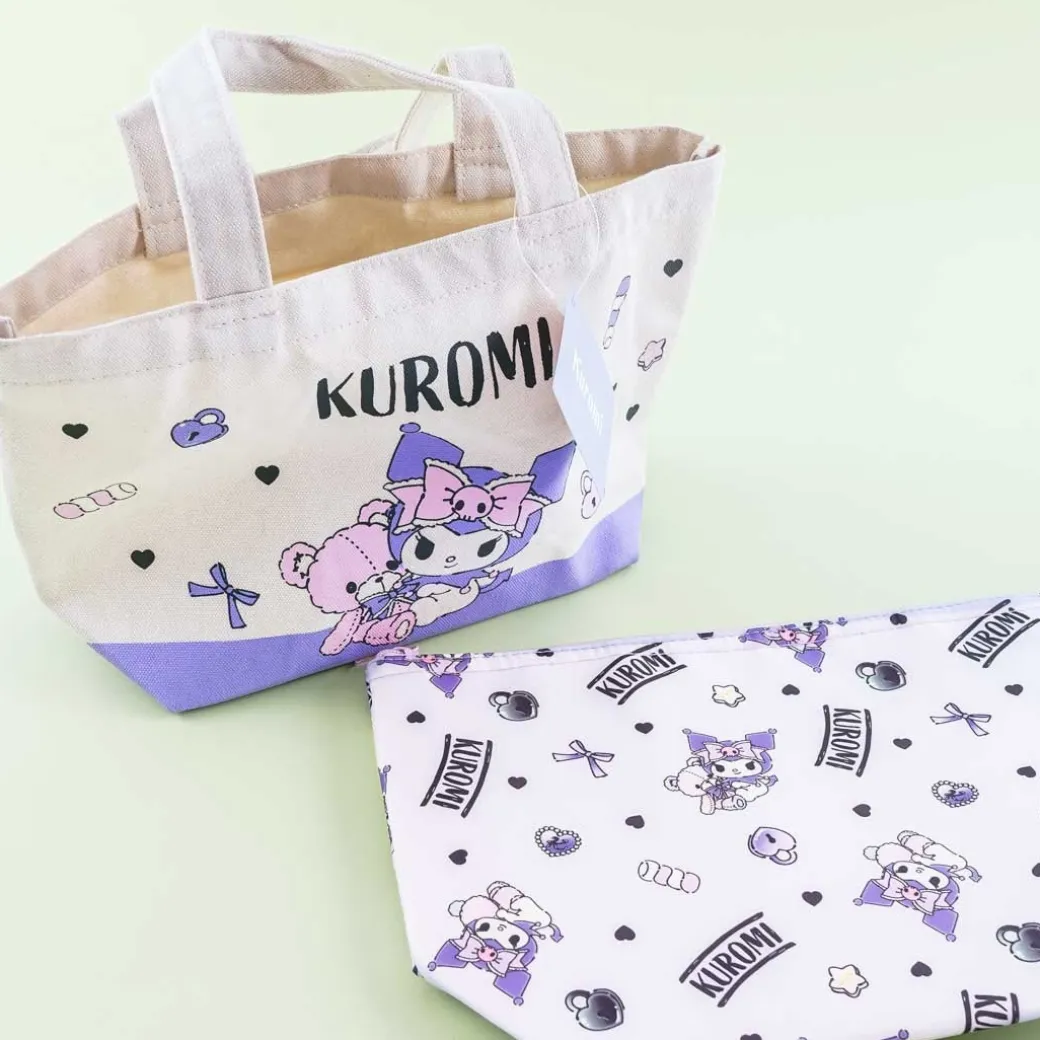 - A super kawaii canvas tote bag and pouch set illustrated with Kuromi, ribbons, and heart-shaped locks
