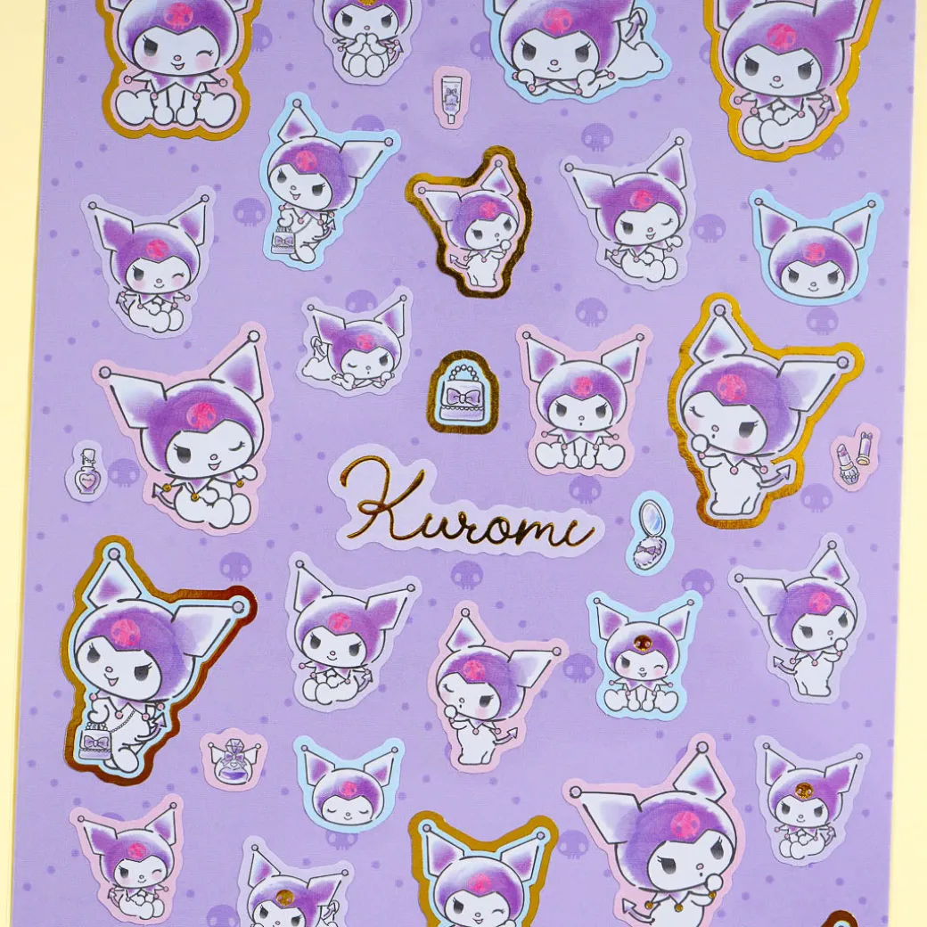 This super kawaii sheet of stickers showcases Kuromi making all sorts of cheeky poses. Use it to decorate your favorite journal or planner! Some of the stickers feature lovely golden accents.