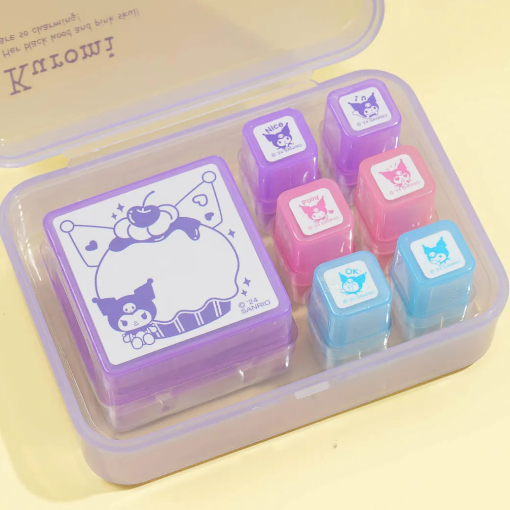 Use this kawaii set of stamps to decorate your journal. It showcases Kuromi with a giant cupcake and Kuromi making different poses! This set has a big stamp and small stamps for you to use.