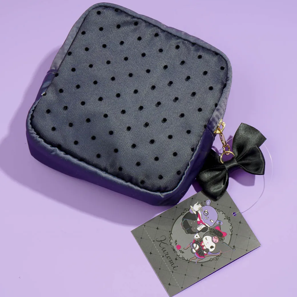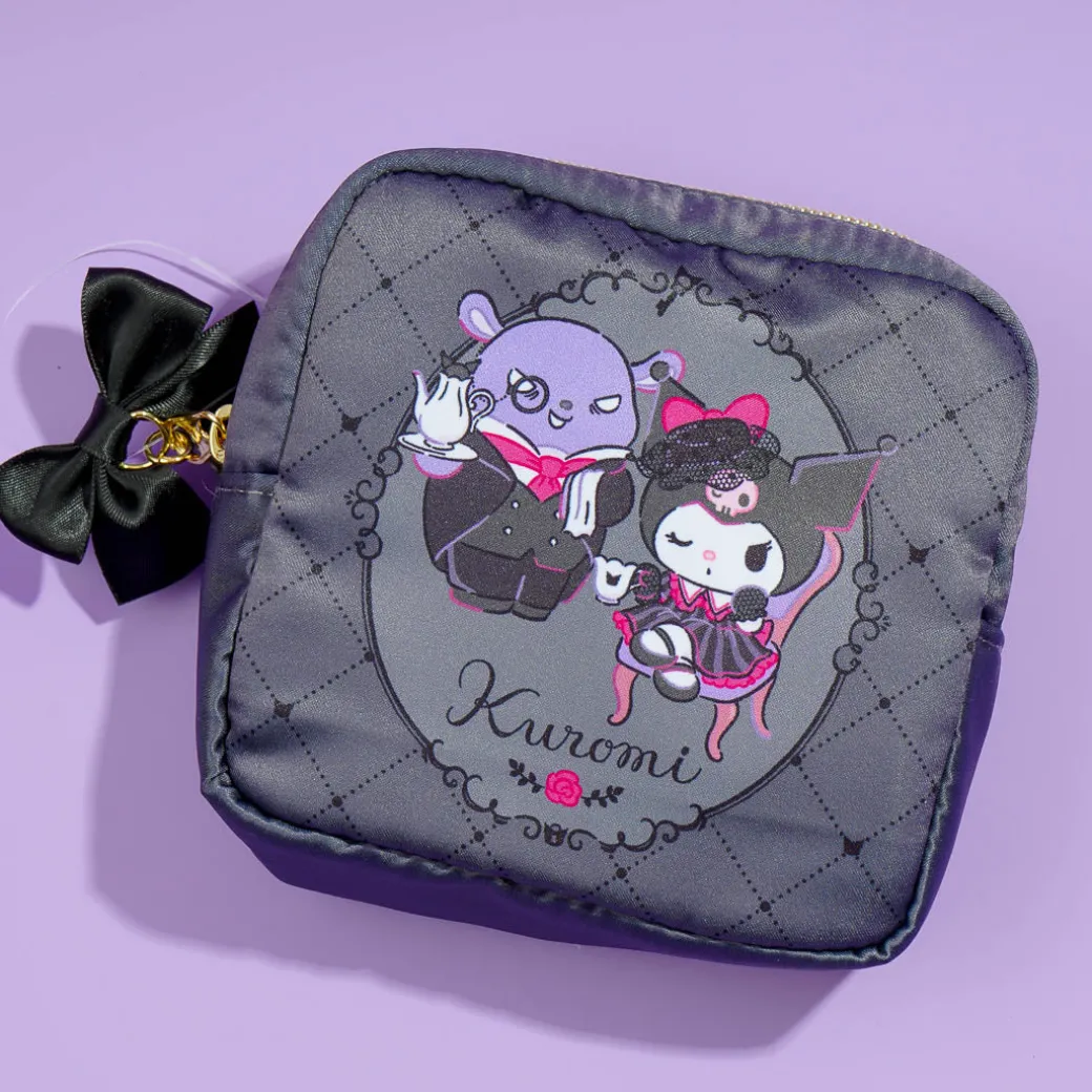 This super cute pouch showcases prints of Kuromi and her bestie Baku dressed as Dark Lolita characters. Use this handy square-shaped pouch to organize your trinkets and small cosmetics! It has a zipper closure with a cute ribbon decor.