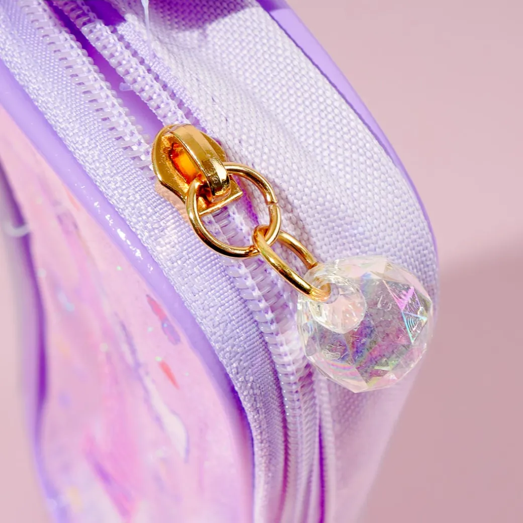This super kawaii pen case is covered in prints of Kuromi surrounded by sweet treats. Use it to organize your pens, pencils, highlighters, and more. It has a transparent side that lets you see all of your things and a zipper closure with a crystal charm!