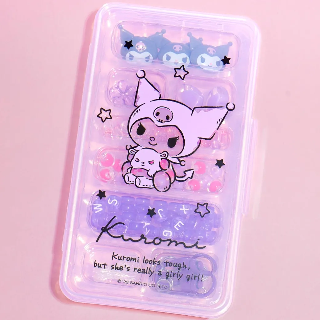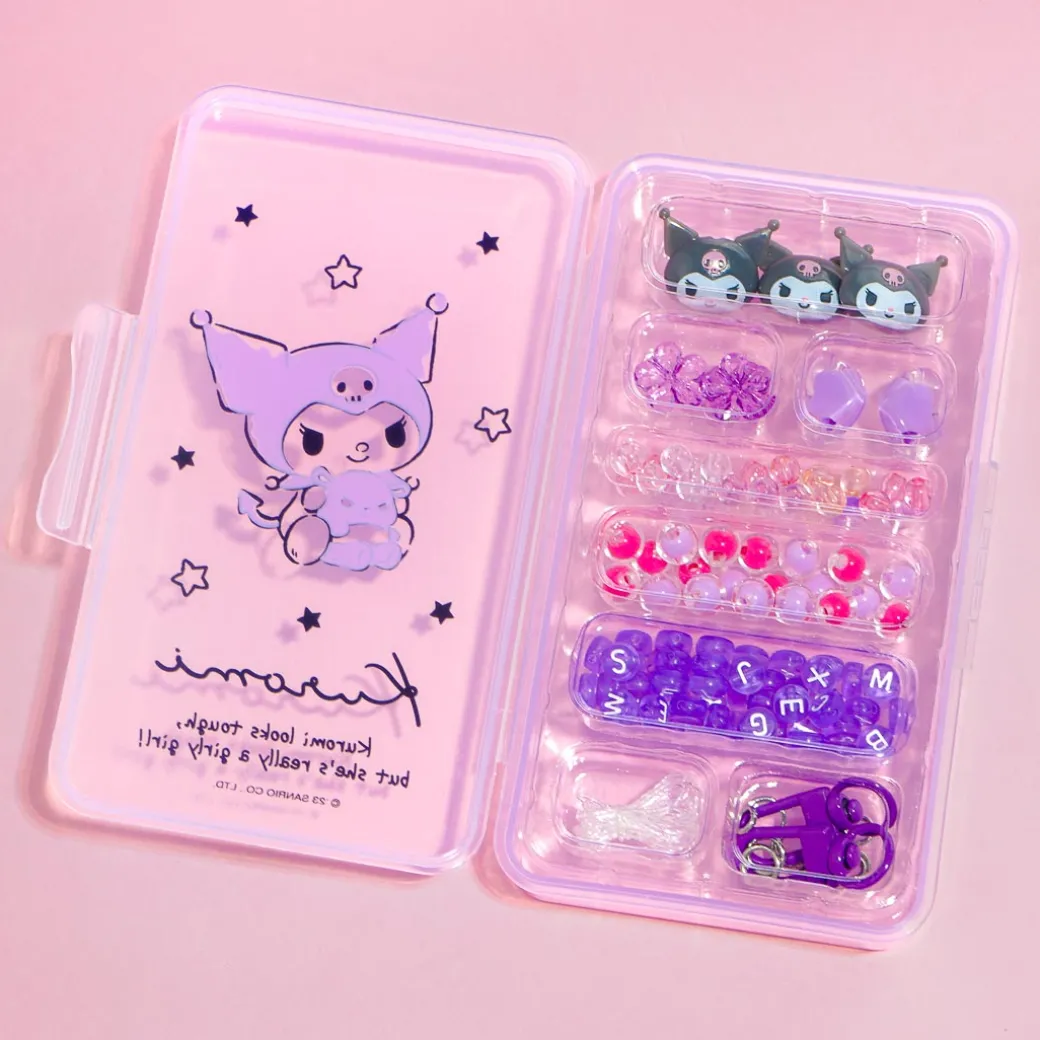 Have fun creating cute bracelets and keychains with this bead kit! It has Kuromi-themed beads in different shapes and sizes. You can even personalize your accessory using the alphabet beads.