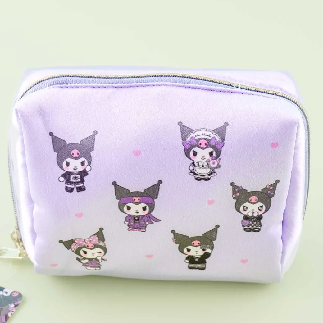 - Akawaii zippered pouch illustrated with prints of Kuromi in different fancy outfits