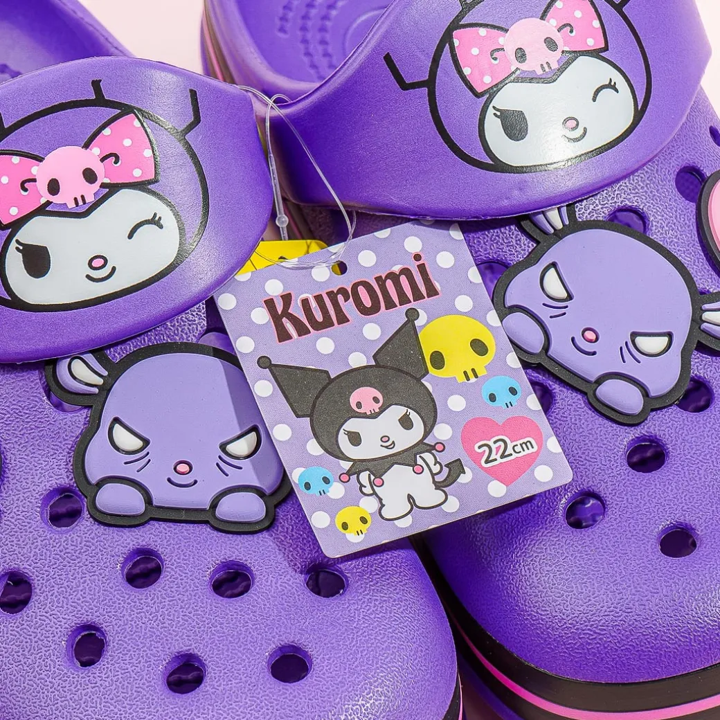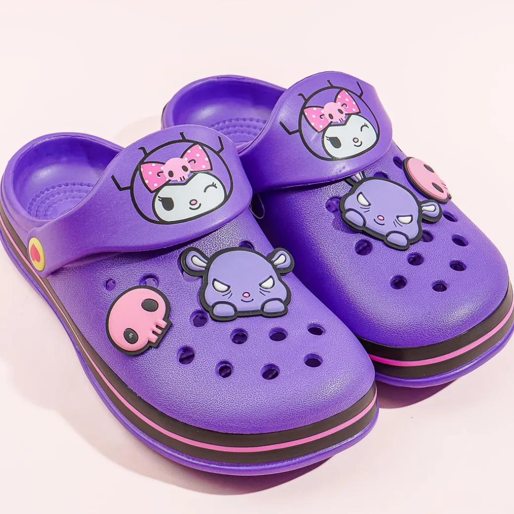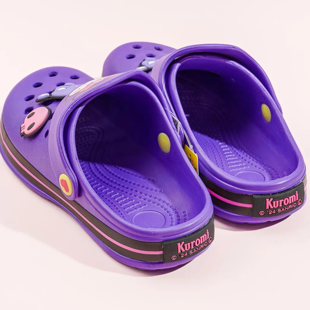Lounge around your house comfortably by wearing these super cute sandals! The small-sized slippers have kawaii prints of Kuromi and rubber charms of pink skulls and Baku! This purple pair is made with a rubber-like resin material called EVA.