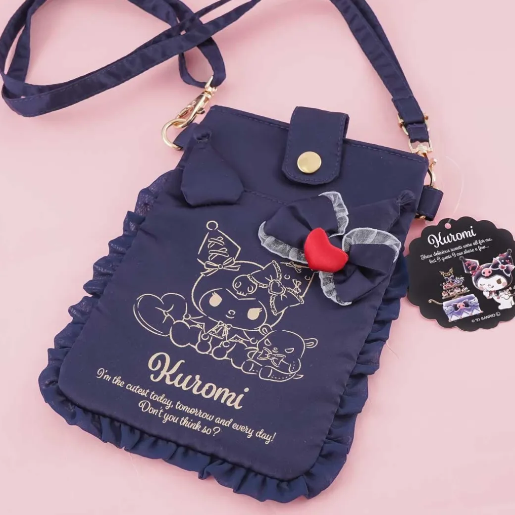- A kawaii and frilly dark-colored pouch illustrated with Kuromi waring a Gothic Lolita dress