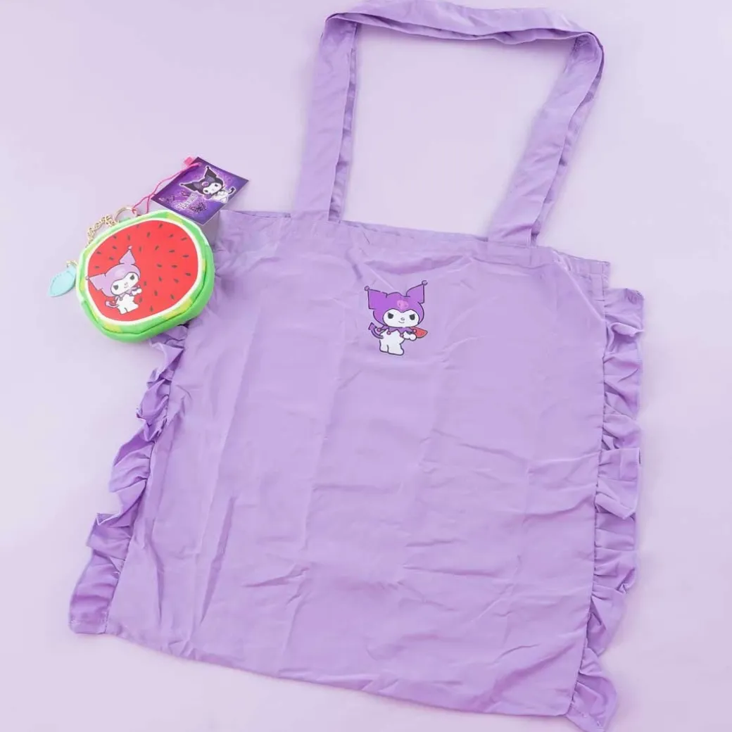 - A kawaii frilly eco bag illustrated with Kuromi carrying a watermelon