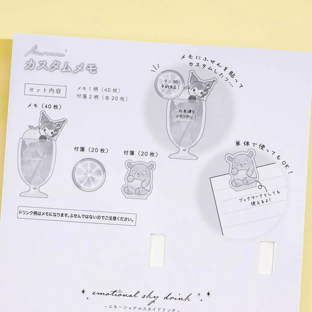 Use this super cute die-cute memo pad and sticky note set to write down important reminders. It showcases Kuromi and her bestie Baku playing with a magical ice cream soda! Add this memo pad and sticky note set to your stationery collection.