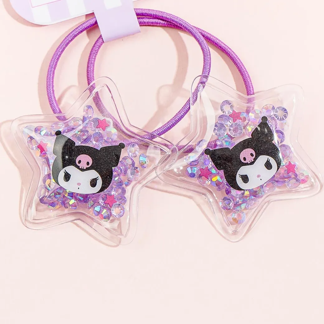 Give yourself a cute pigtail hairdo with these hair ties. They have star-shaped charms illustrated with Kuromi! Each one is filled with glitter.