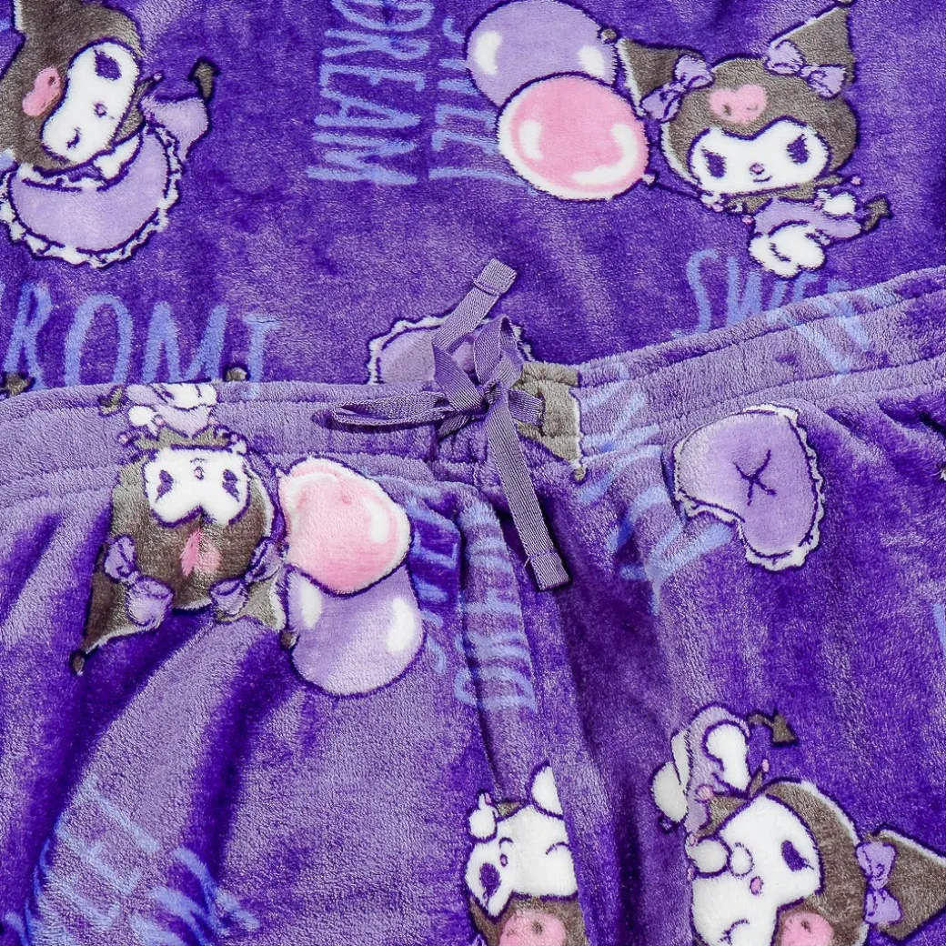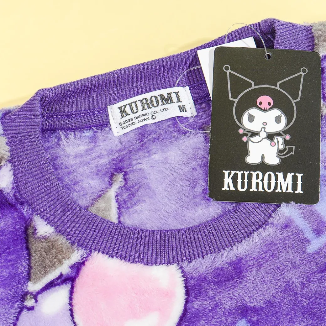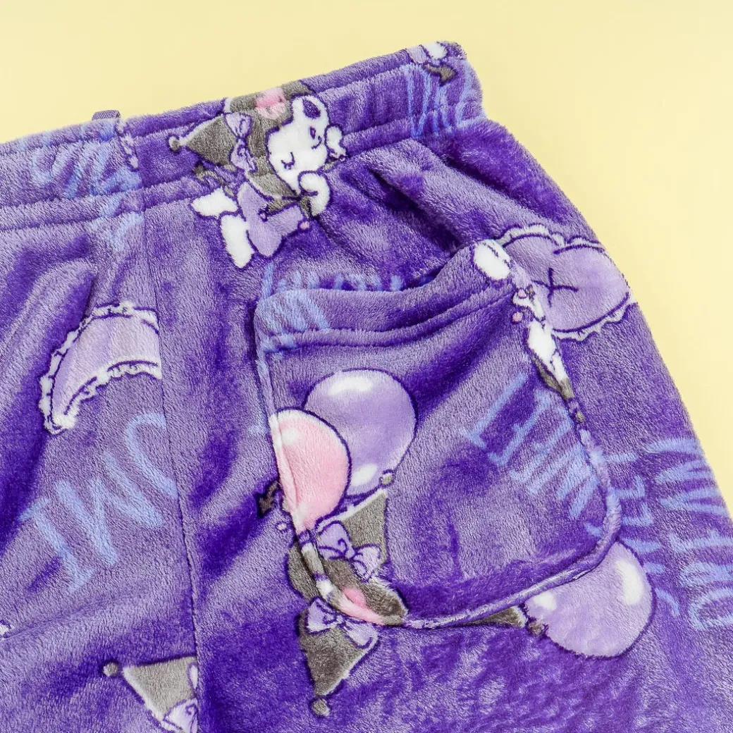 Keep yourself warm and cute even while indoors with this kawaii medium-sized loungewear set! It includes a long-sleeved sweatshirt and a pair of drawstring pants that are decorated with prints of Kuromi and her fun daily activities.