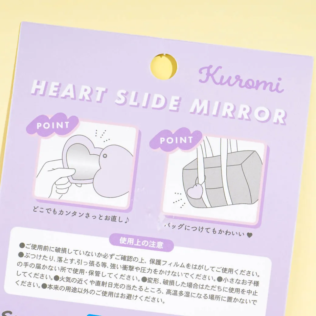This compact heart-shaped slide mirror features a print of Kuromi carrying a ribbon. Use it to check on your makeup while traveling! You can attach this handy mirror to your bag with its removable ball chain.