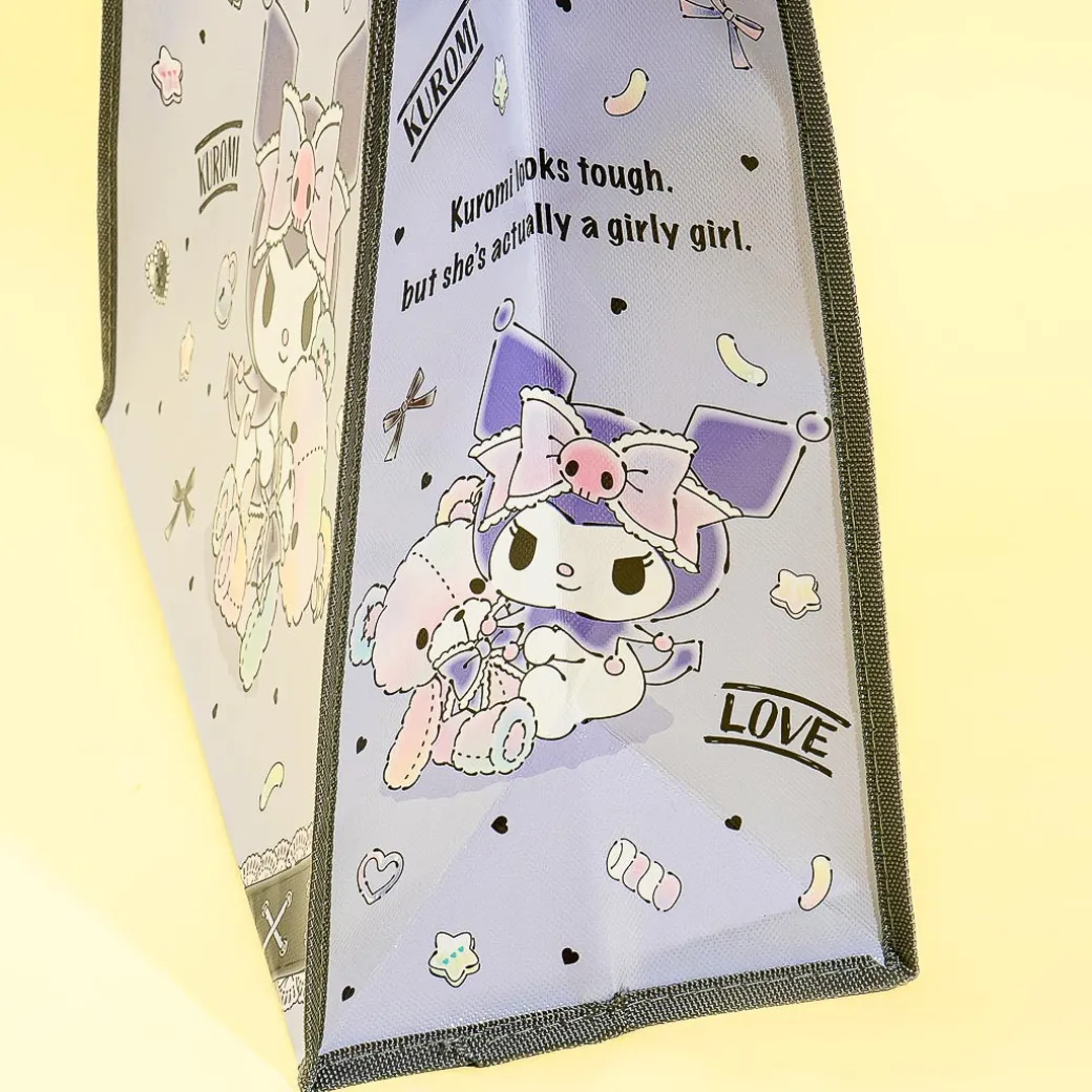 Place your books, snacks, and even groceries inside this roomy tote bag! It’s decorated with super kawaii prints of Kuromi and lots of black Gothic Lolita bows.