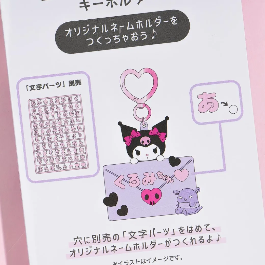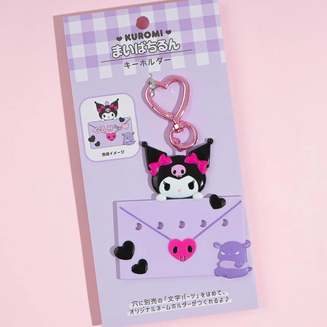 Organize your keys with this kawaii keychain! It features Kuromi with a love letter and a heart-shaped metal clip. You can also customize this keychain using special Japanese hiragana characters.