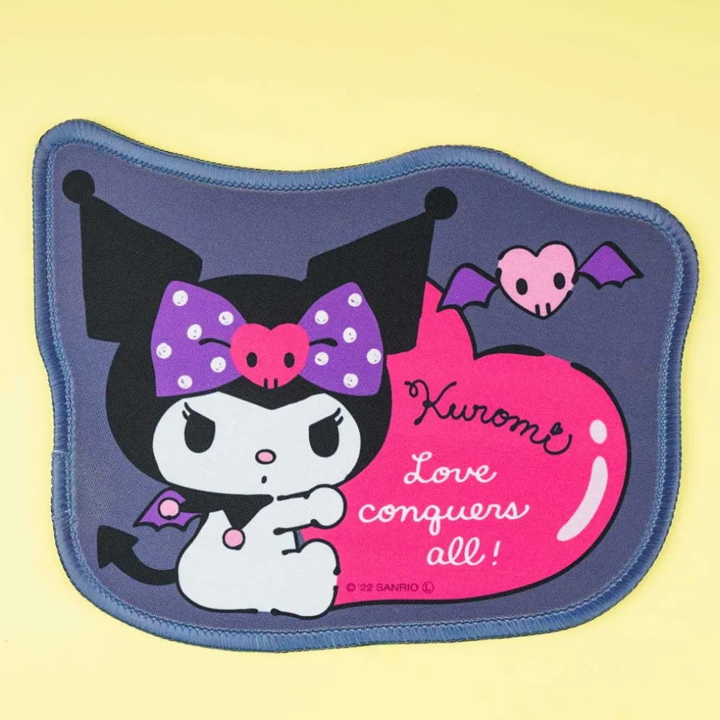 - A kawaii die-cut mouse pad decorated with a print of Kuromi and a giant heart
