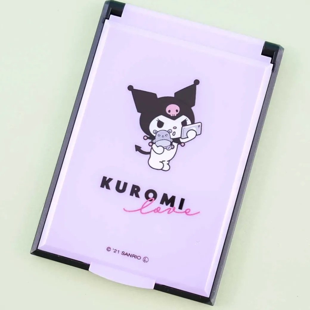 - A super cute folding mirror featuring a print of Kuromi playing with her phone