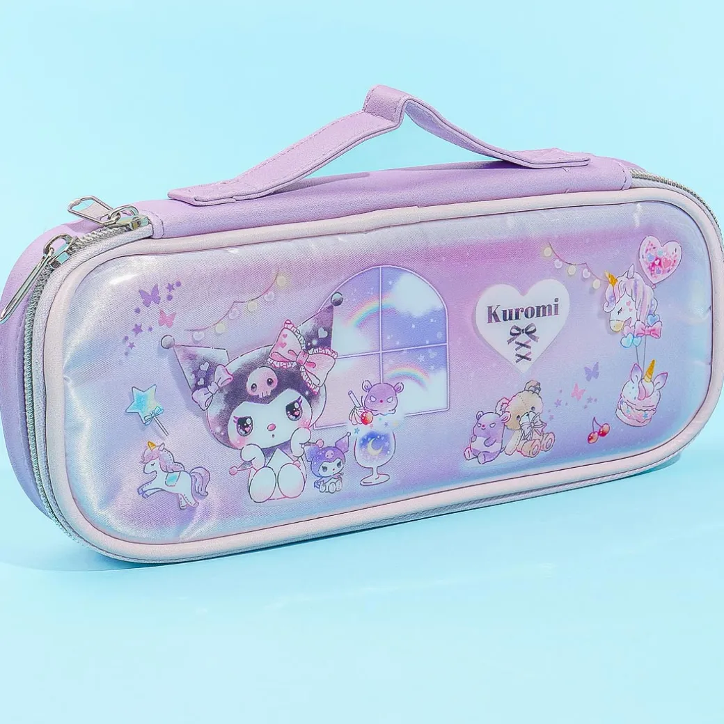 Organize your favorite pens inside this kawaii and shiny case! It has rounded edges and is decorated with a super cute illustration of Kuromi gushing over her favorite things inside a magical bedroom.