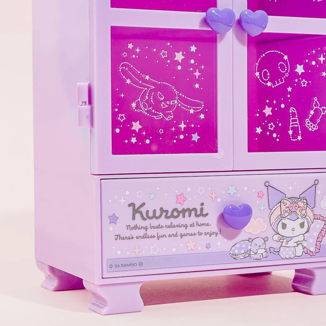 Keep your favorite bracelets and rings inside this super cute accessories case! It looks like a miniature version of Kuromi’s bedroom closet. It has double doors, two shelves, and a single pull-out drawer. The transparent windows of the case are also decorated with prints of Kuromi, constellations, and makeup products!