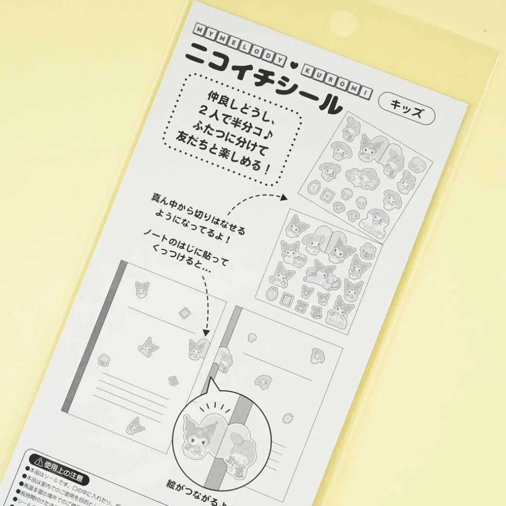 - A super kawaii sheet of stickers illustrated with Kuromi and My Melody playing with small versions of themselves