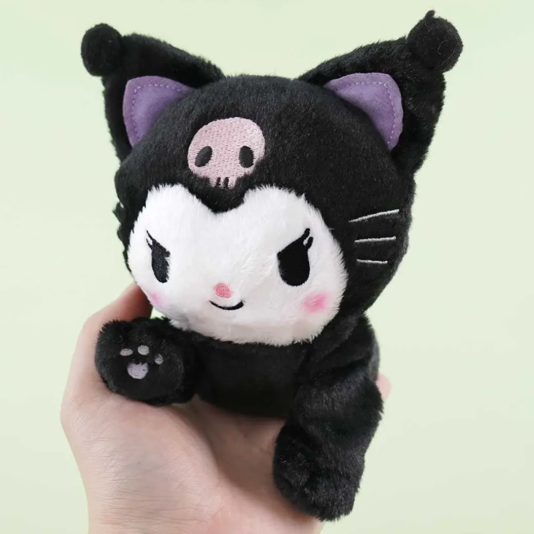This kawaii Kuromi plushie in a cat onesie has a rugged finish — so you can make it do different poses besides sitting down! Take this medium cutie on your next adventure by attaching it to your travel bag with its removable ball chain. A super cute medium-sized Kuromi plushie wearing a cat onesie Features a rugged finish that can make the plushie do poses Comes with a detachable ball chain Original licensed product by Sanrio Japan