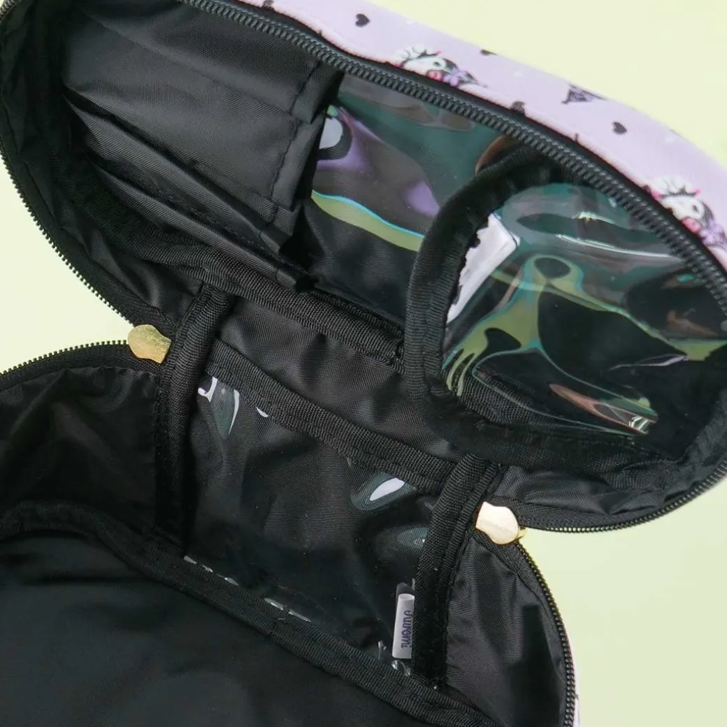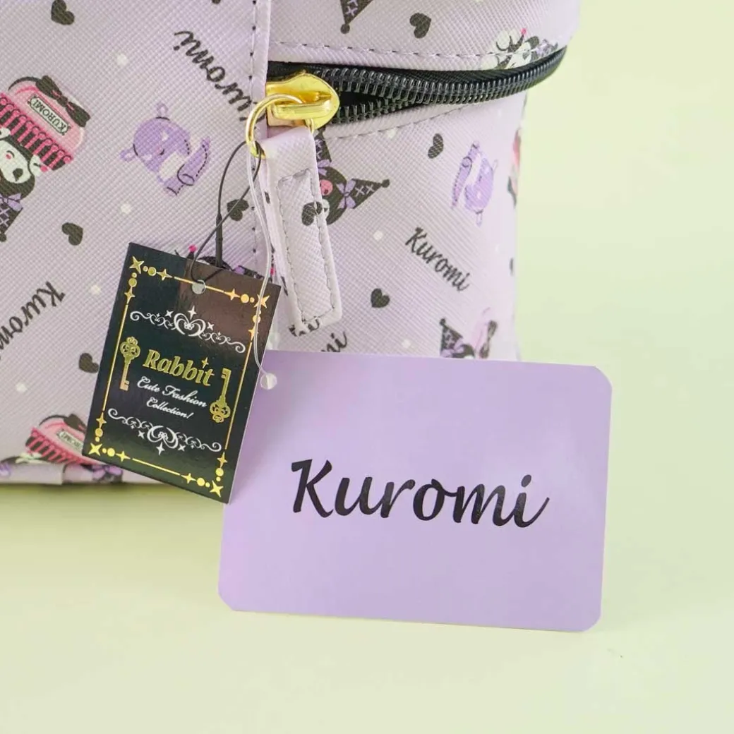 - A super kawaii beauty bag with a handle and has prints of Kuromi playing the piano