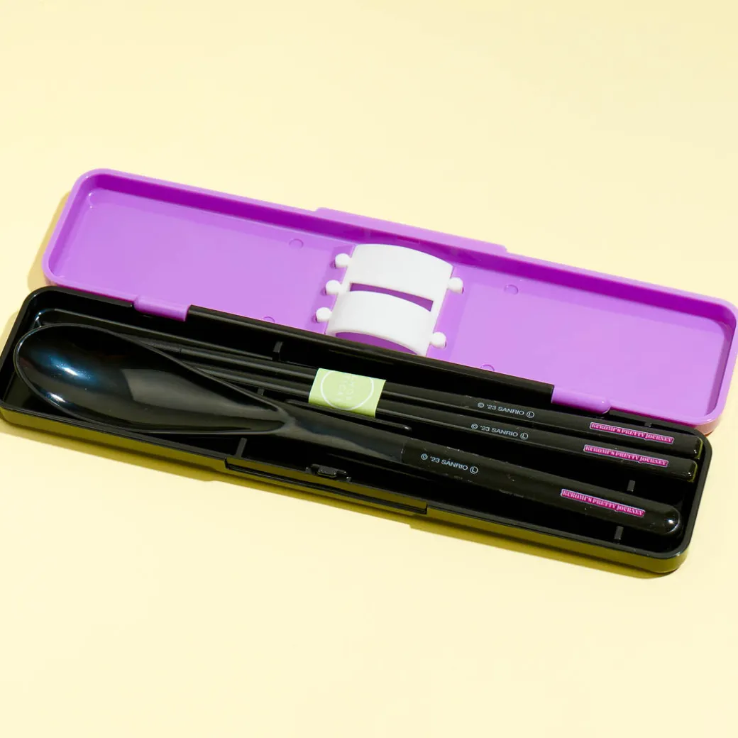 Use this super cute utensil set to eat your favorite meals for lunch! It features prints of Kuromi hanging out with her friends and capturing it on film. This utensil set has a pair of chopsticks and a spoon.