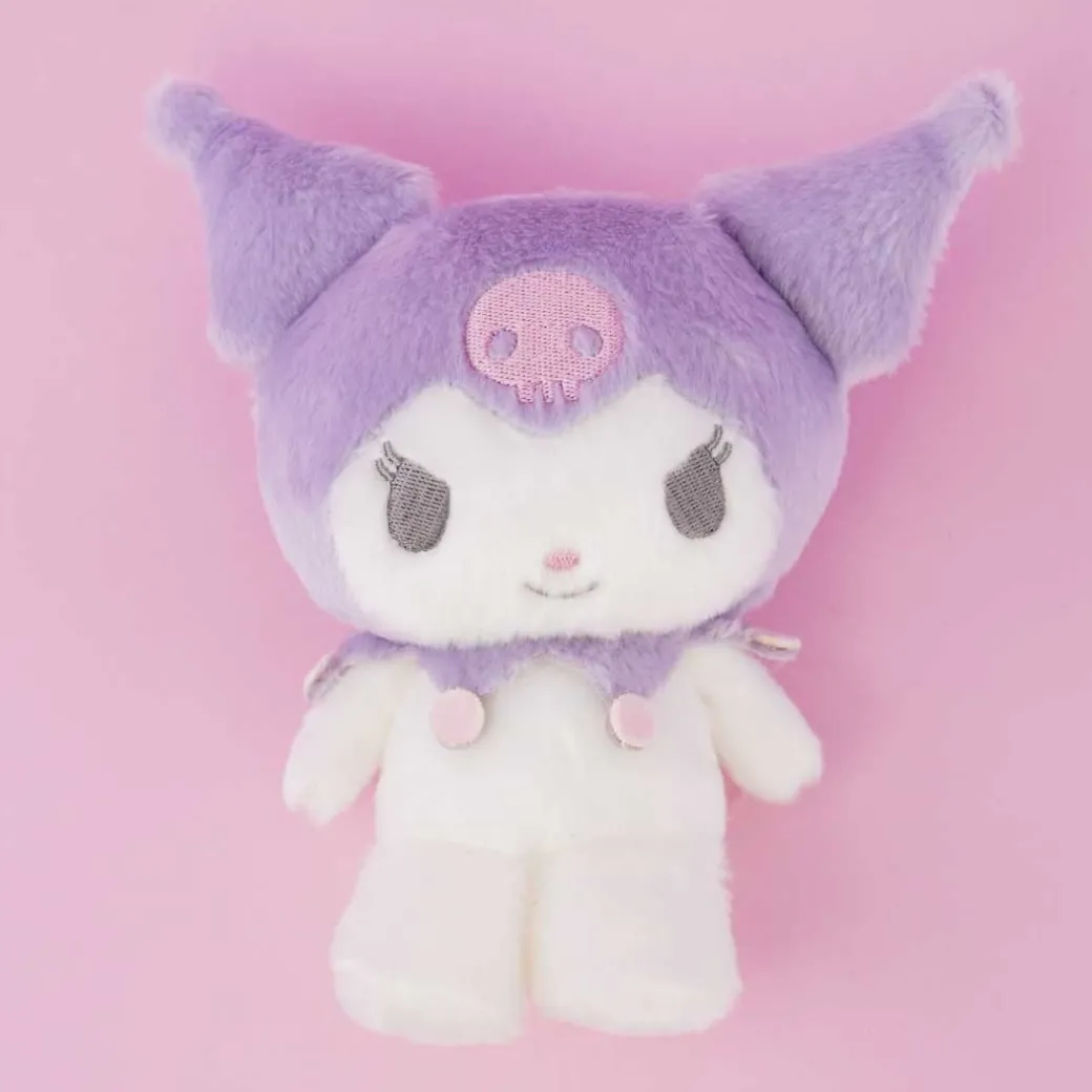 - A super cute medium-sized Kuromi plushie with purple pastel colors and a skull printed on its head