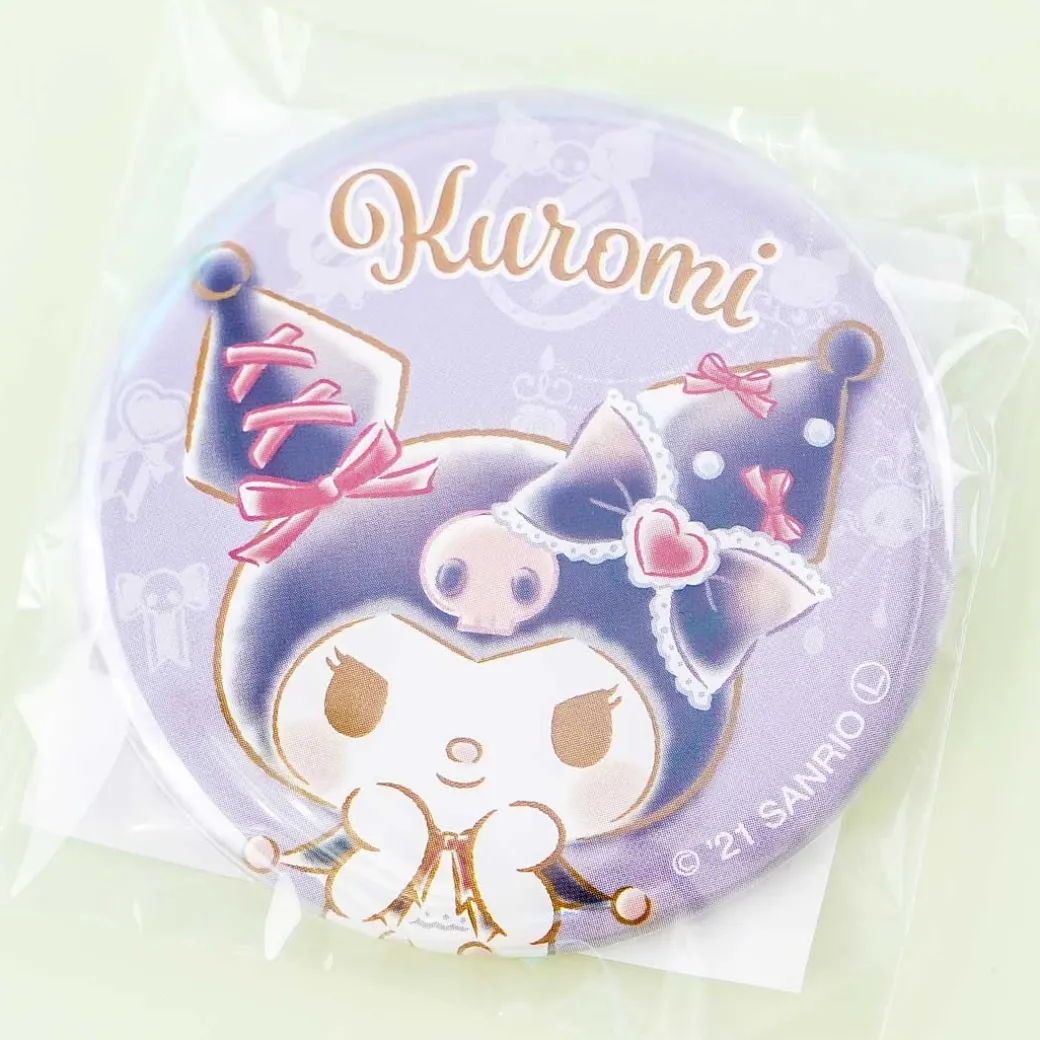- A super kawaii steel badge illustrated with a print of Kuromi wearing ribbon accessories