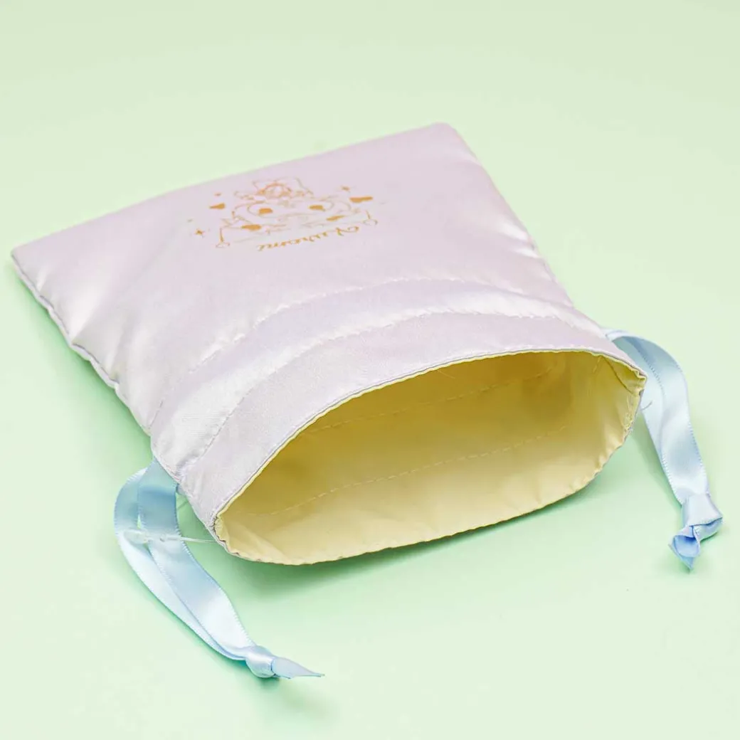 Use this cute drawstring pouch to store your charms! It features a print golden print of Kuromi surrounded by sparkles and hearts. All you have to do to close the pouch is pull the strings.