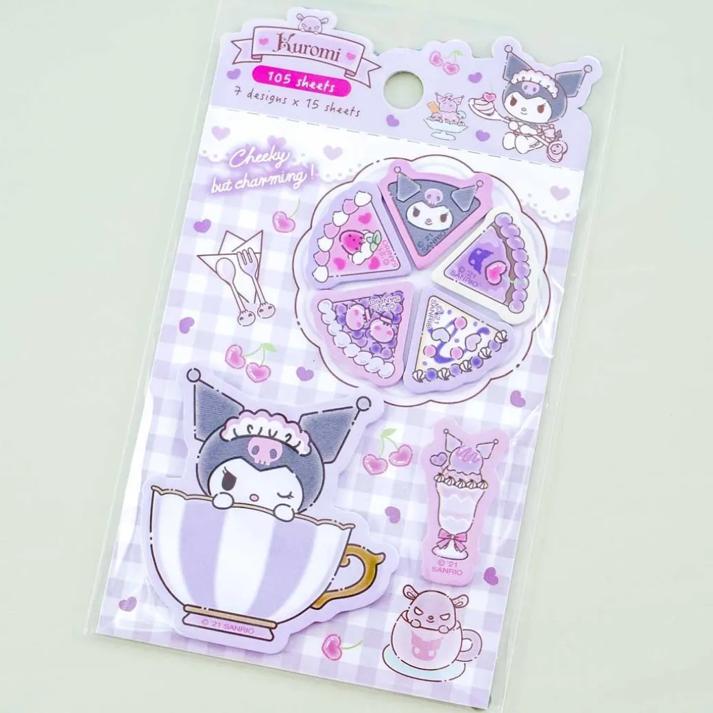 - A super cute set of die-cut sticky note tabs featuring Kuromi, teacups, cake slices, and parfaits