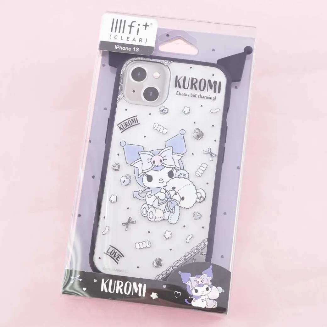 - A super cute die-cut clear phone case for the iPhone 13 illustrated with Kuromi playing with a bear