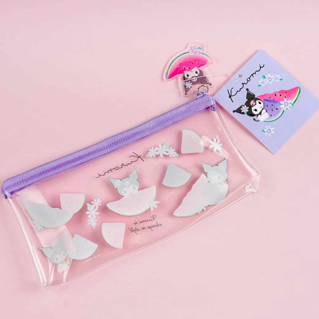 Bring this kawaii clear pen case to school with you! This flat zippered case features cute prints of Kuromi with pink and purple colored watermelon slices.