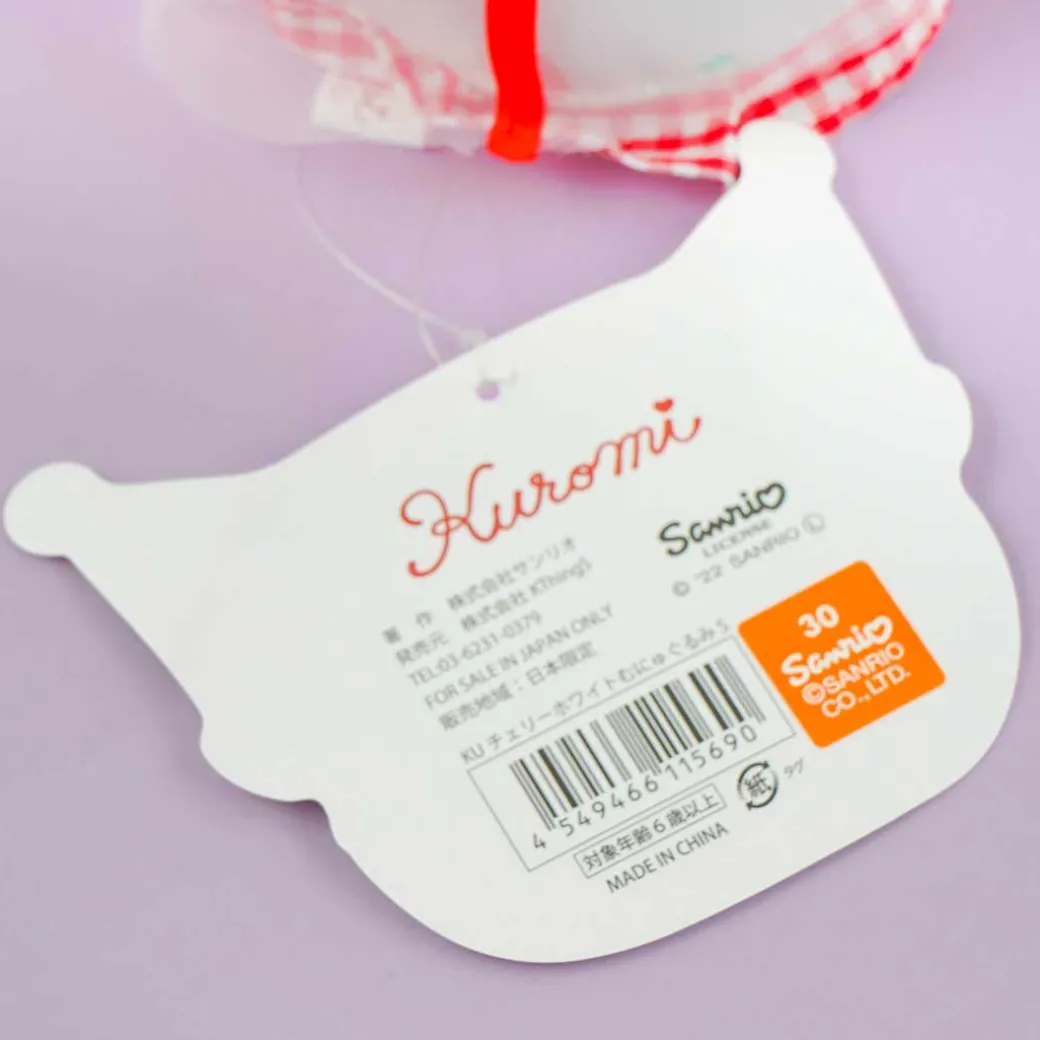 Enjoy playing pretend dress-up with this small-sized cutie! This Kuromi plushie is wearing a super kawaii white dress that’s decorated with red bows, gingham patterns, and lots of cherries.