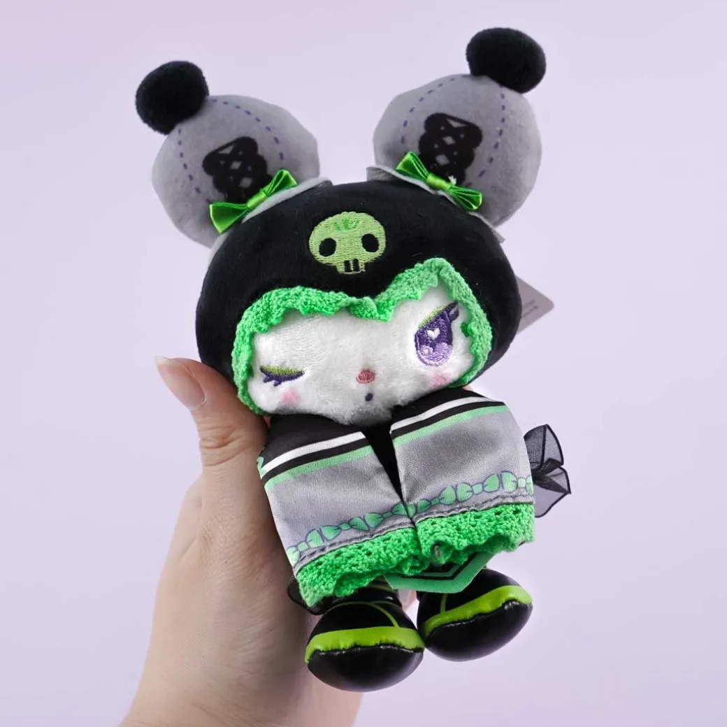 - A medium-sized Kuromi plushie in a green and black lolita-inspired costume