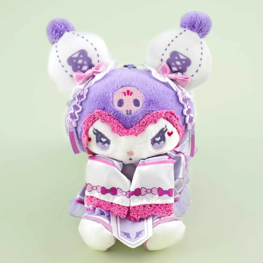 - A medium-sized Kuromi plushie wearing a white lolita-inspired costume