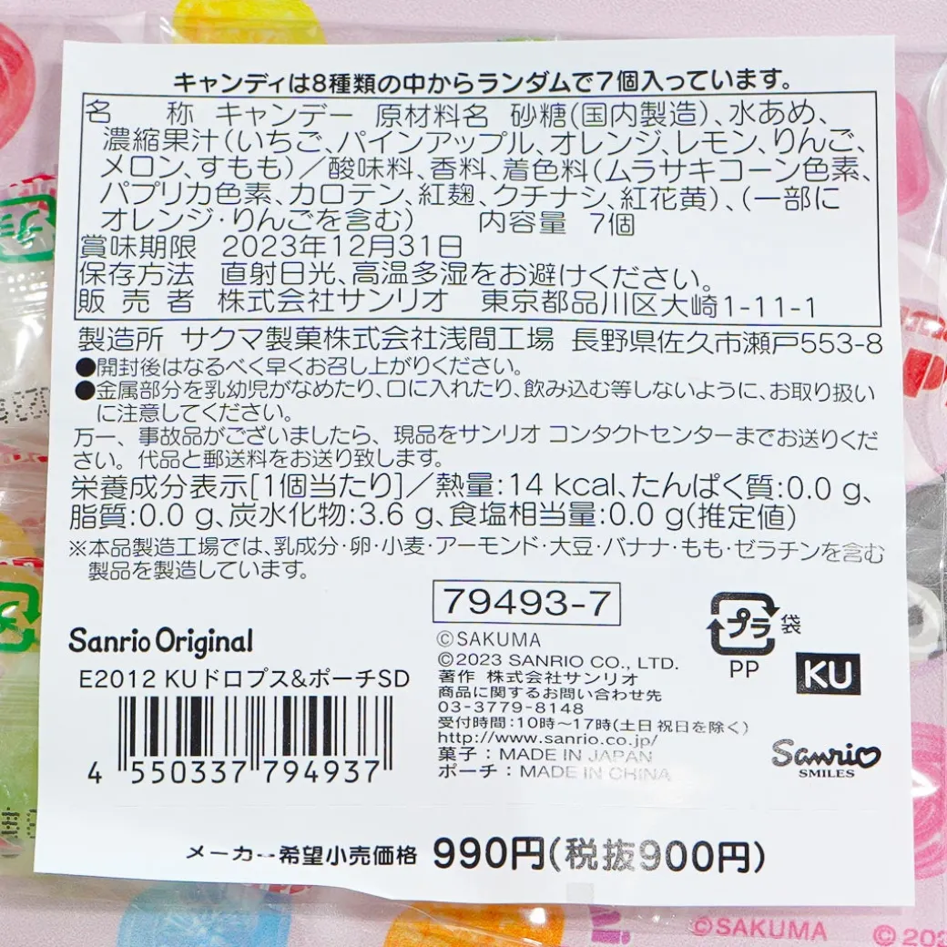 Organize your loose change, train pass, and other small essentials inside this super cute pouch! It has illustrations of Kuromi’s different faces and colorful Sakuma Drops. This handy pouch also comes with free candy drops!