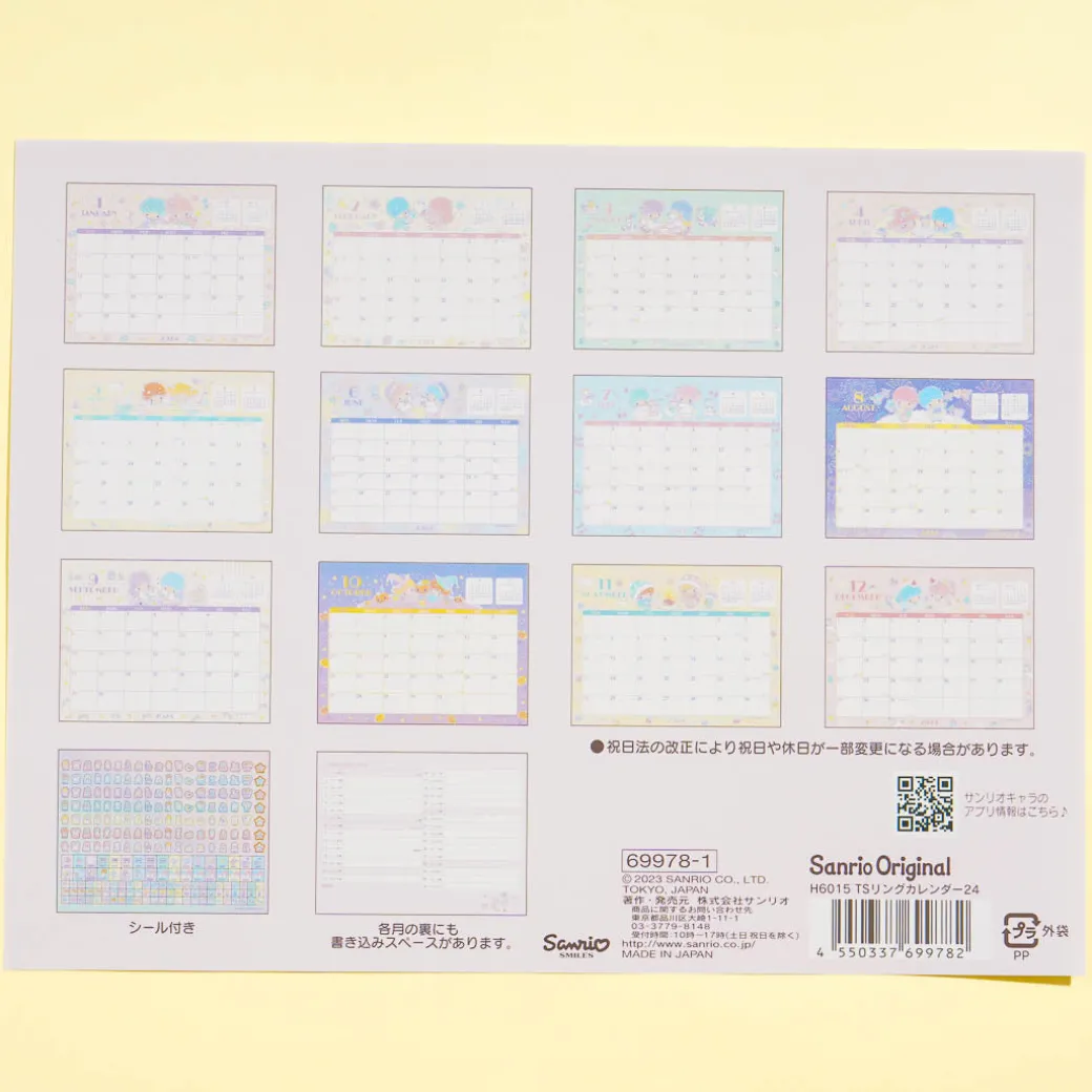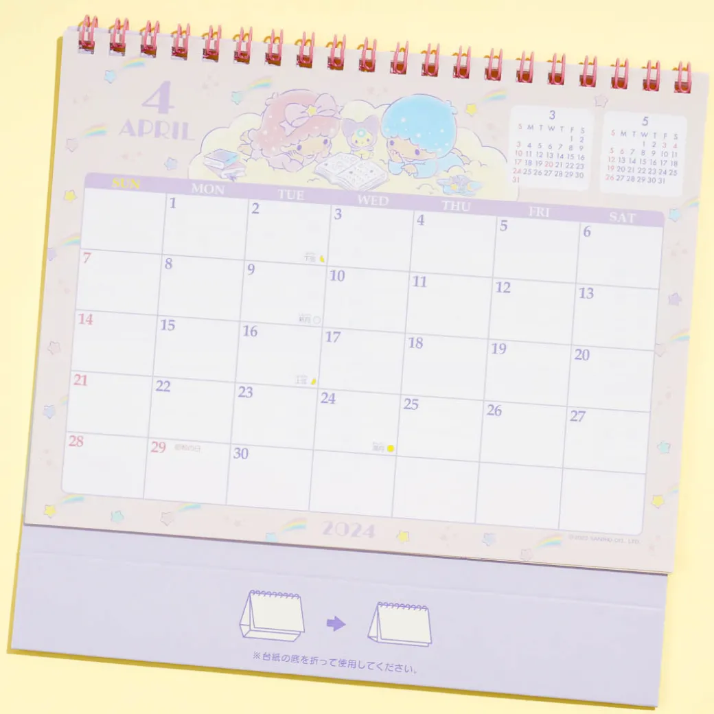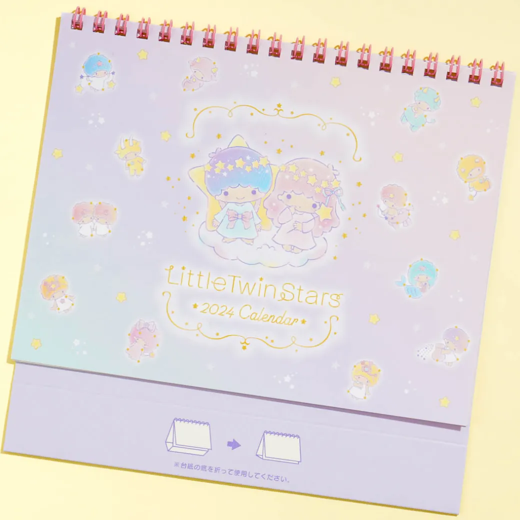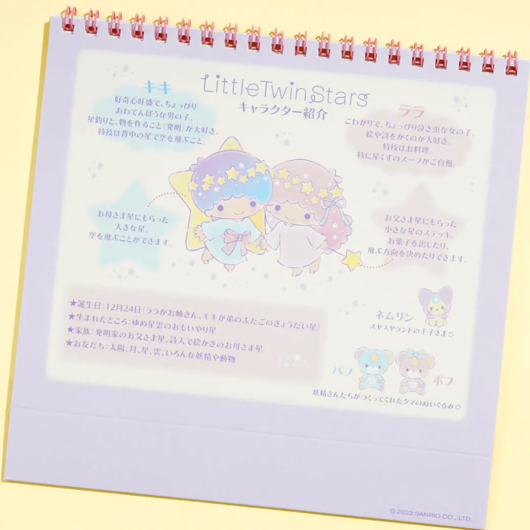 Add a dose of cuteness to your workspace with this super cute desk calendar featuring Little Twin Stars in a starry sky! It’s made from high-quality paper and allows you to easily view dates and write down your reminders. This 2024 calendar is ring-bound and features a folding cardboard stand. It also has an additional page that tells about the Little Twin Stars characters!