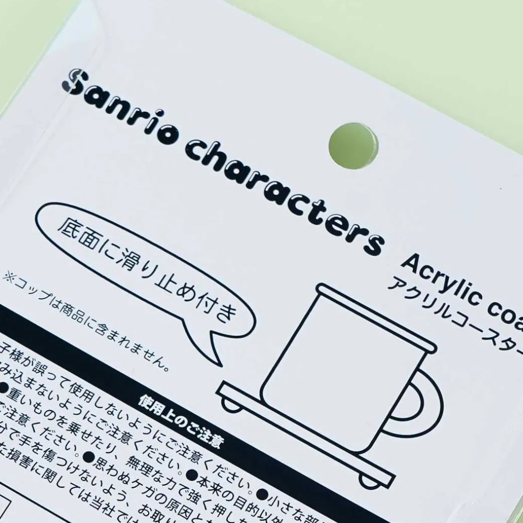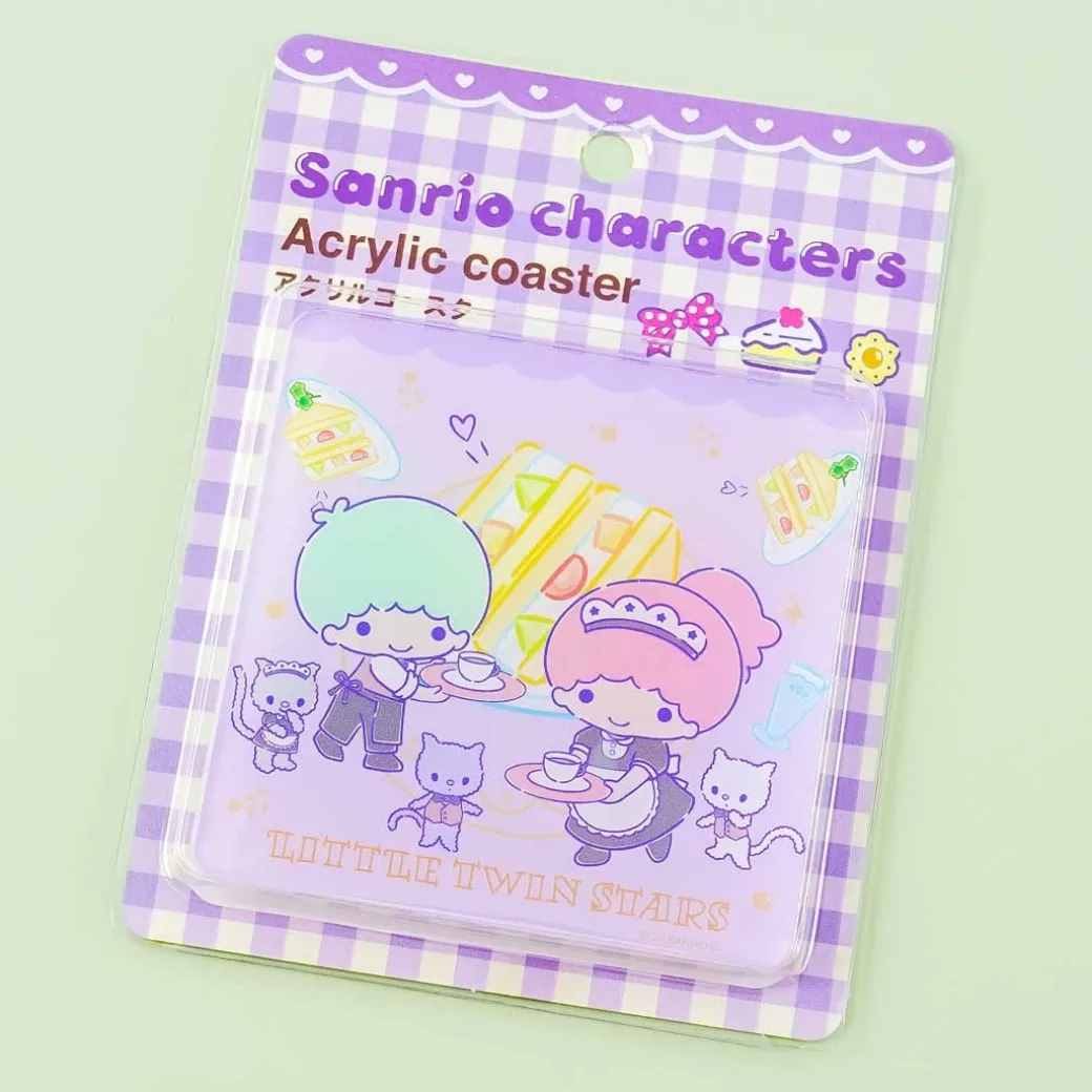 - A kawaii acrylic coaster illustrated with the Little Twin Stars serving at a cafe with fruit sandwiches